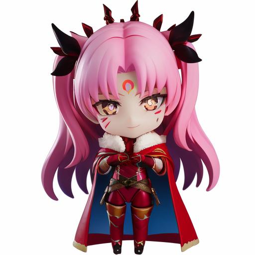 an anime drawing of a woman in a red costume and long, purple hair, 1girl, red cloak, long hair, fur-trimmed cloak, pink hair, cloak, horns, solo, two-tone hair, blue hair, crescent, crescent facial mark, ishtar (fate), multicolored hair, facial mark, forehead mark, two side up, symbol-shaped pupils, star-shaped pupils