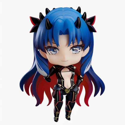 a anime girl with blue hair 1girl, solo, horns, bodysuit, multicolored hair, long hair, ishtar (fate), two-tone hair, black bodysuit, blue hair, red hair, breasts, grey eyes, cleavage cutout, looking at viewer