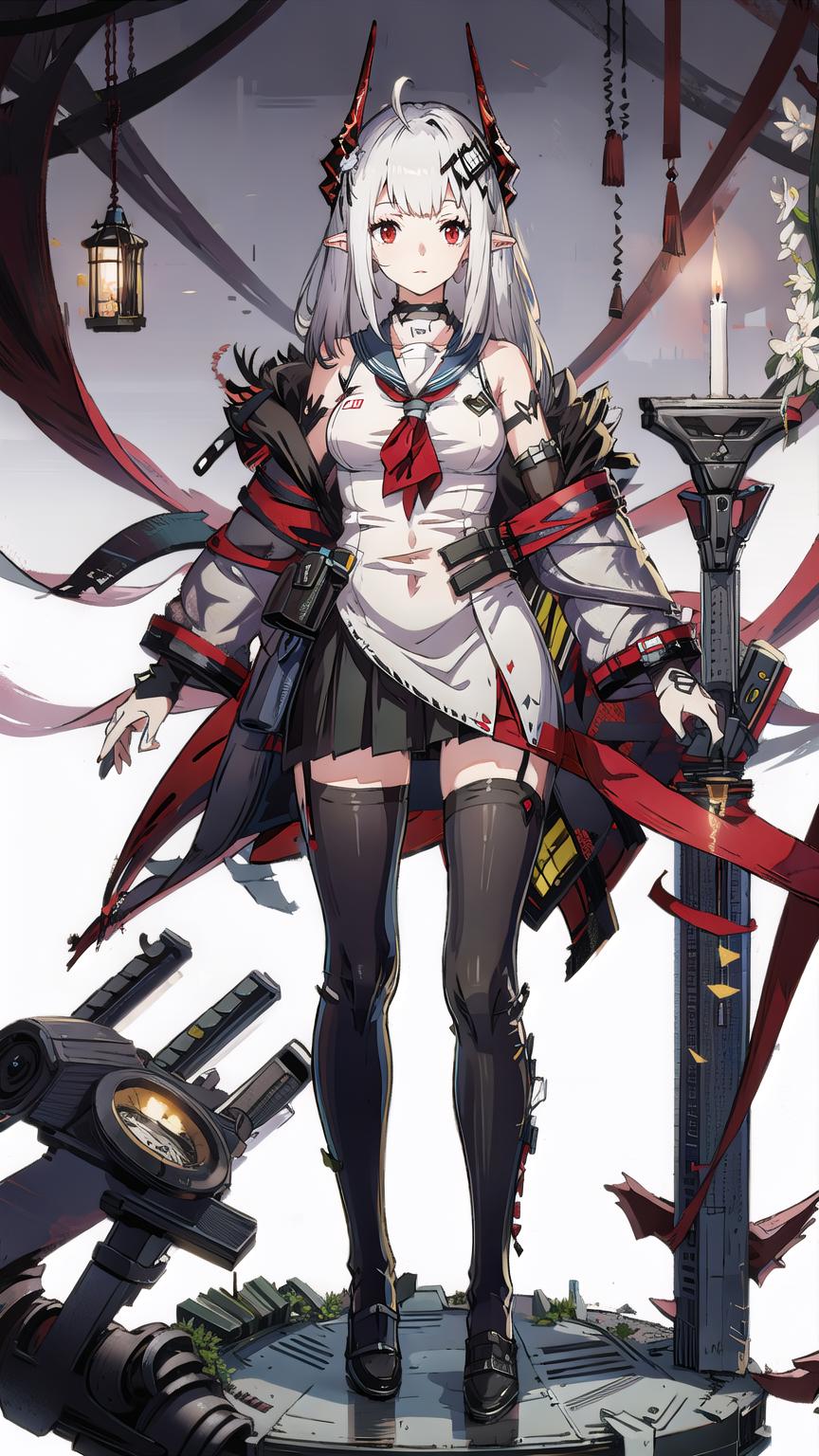 -->プロンプト:mudrockdefclass, 1girl, woman, mudrock (arknights), red eyes, solo, long hair, hair ornament, pointy ears, breasts, white hair, oripathy lesion (arknights), infection monitor (arknights), bangs, breast, black horns, horns,