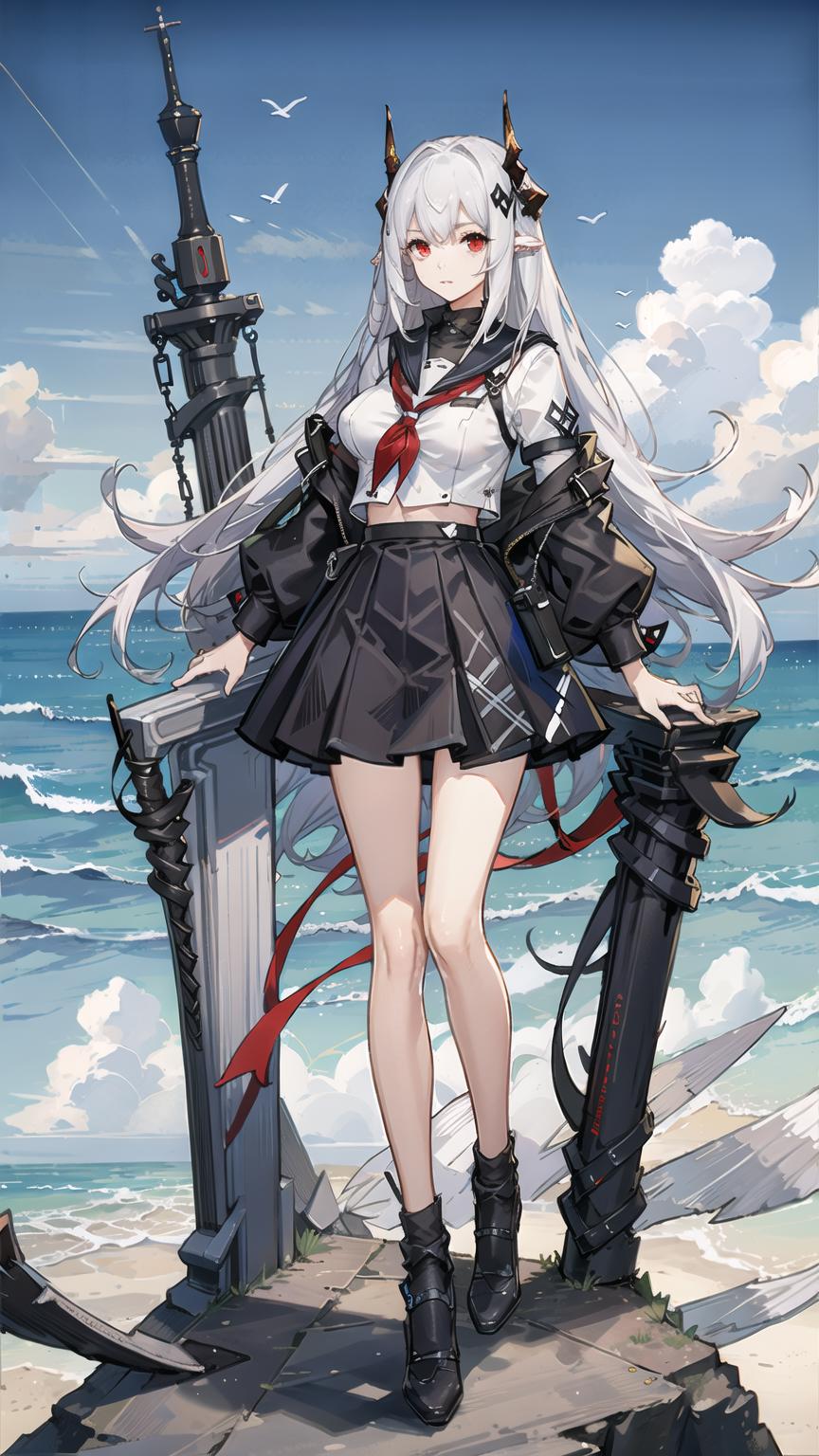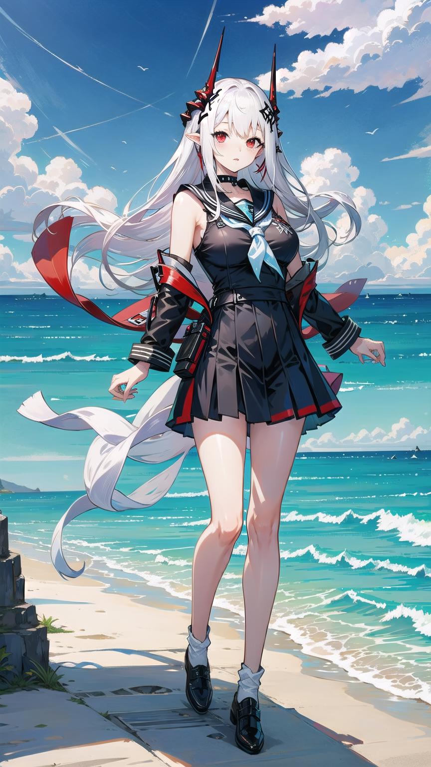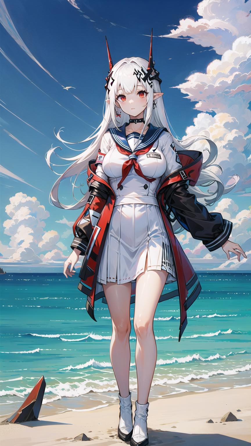1girl, woman, mudrock (arknights), red eyes, solo, long hair, horns, (sailor uniform, serafuku), school uniform, hair ornament, pointy ears, breasts, white hair, oripathy lesion (arknights), infection monitor (arknights), bangs, breast, full body, standing, <lora:MudrockV1-000006:0.6>, mudrockdefclass, black horns, horns, beach background, blue sky, clouds,