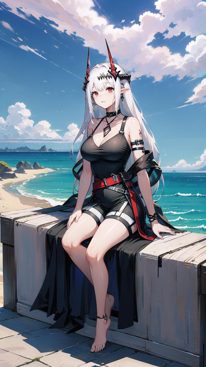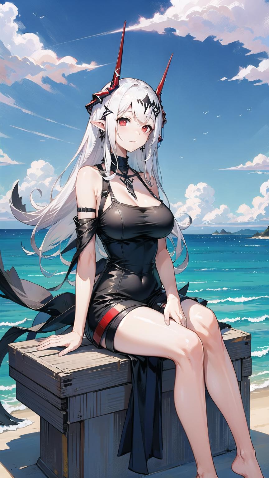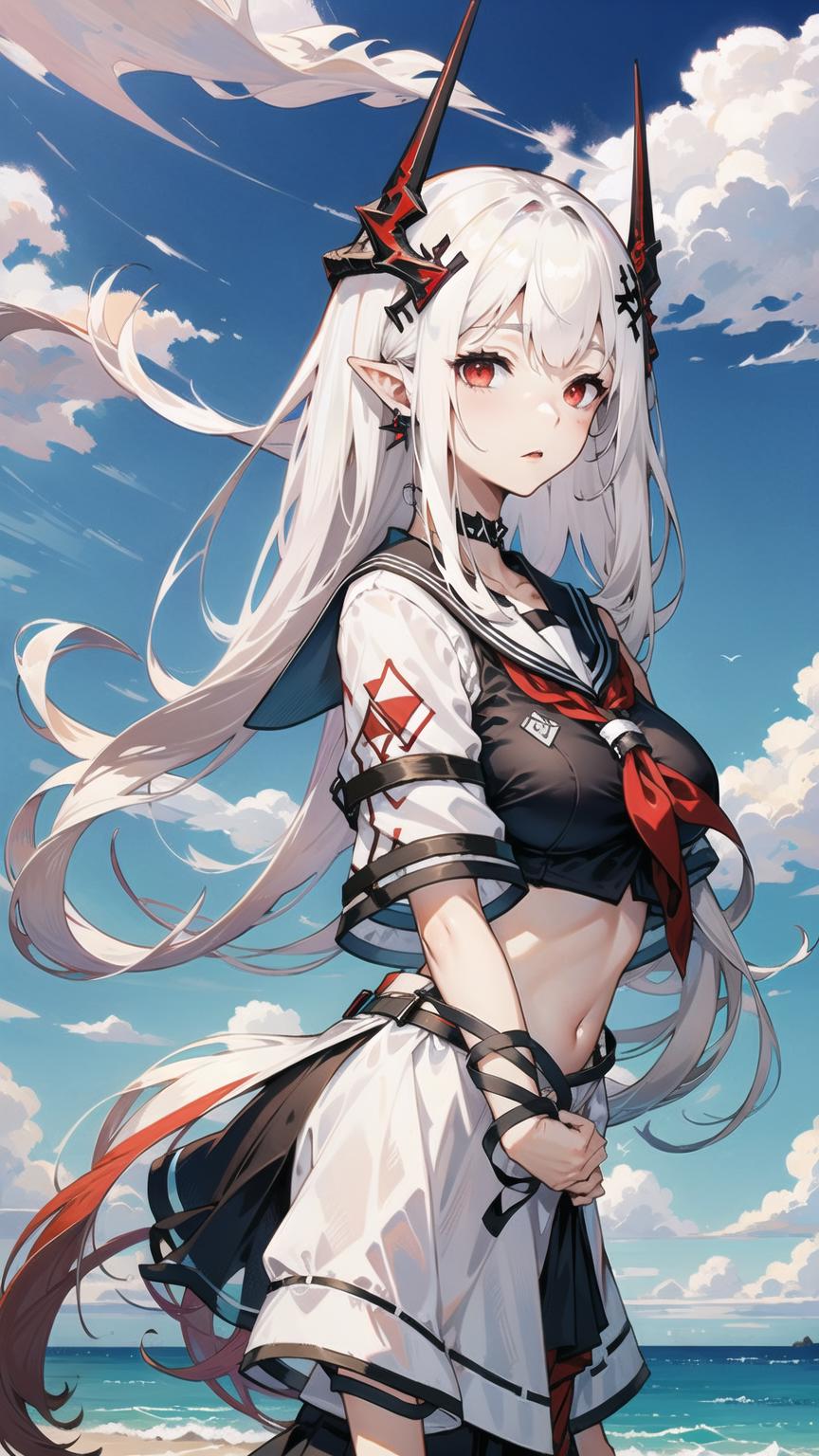 1girl, woman, mudrock (arknights), red eyes, solo, long hair, horns, (sailor uniform, serafuku), school uniform, hair ornament, pointy ears, breasts, white hair, oripathy lesion (arknights), infection monitor (arknights), bangs, breast, full body, standing, <lora:MudrockV1-000006:0.6>, mudrockdefclass, black horns, horns, beach background, blue sky, clouds,