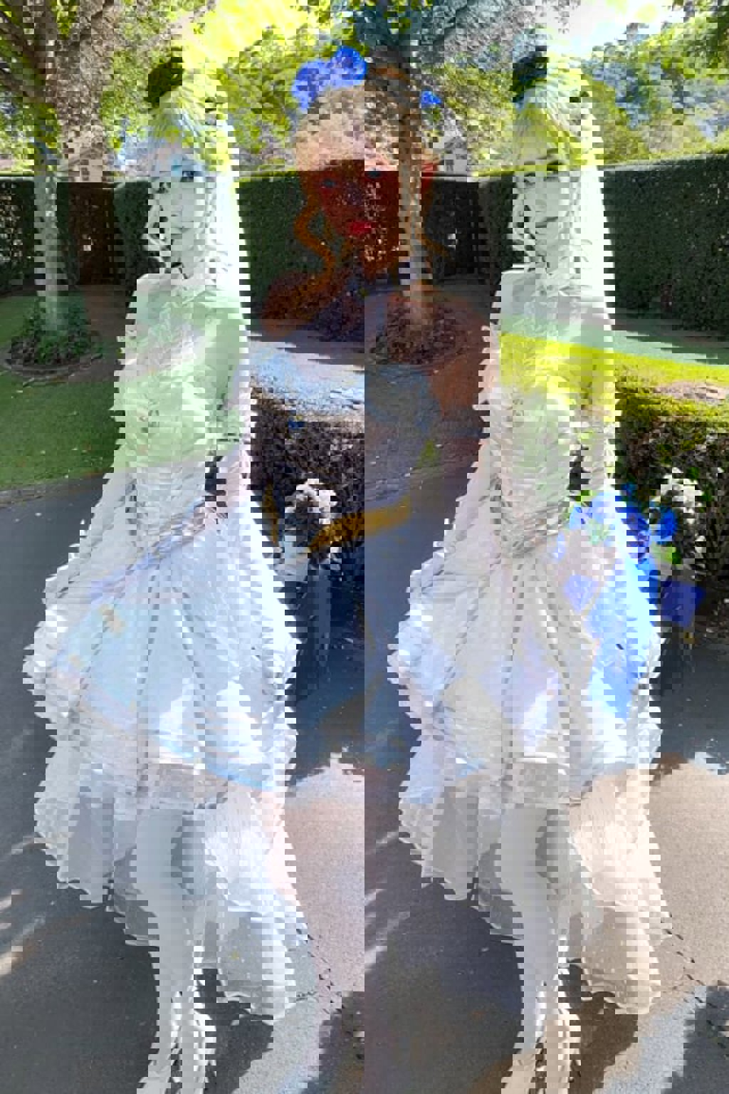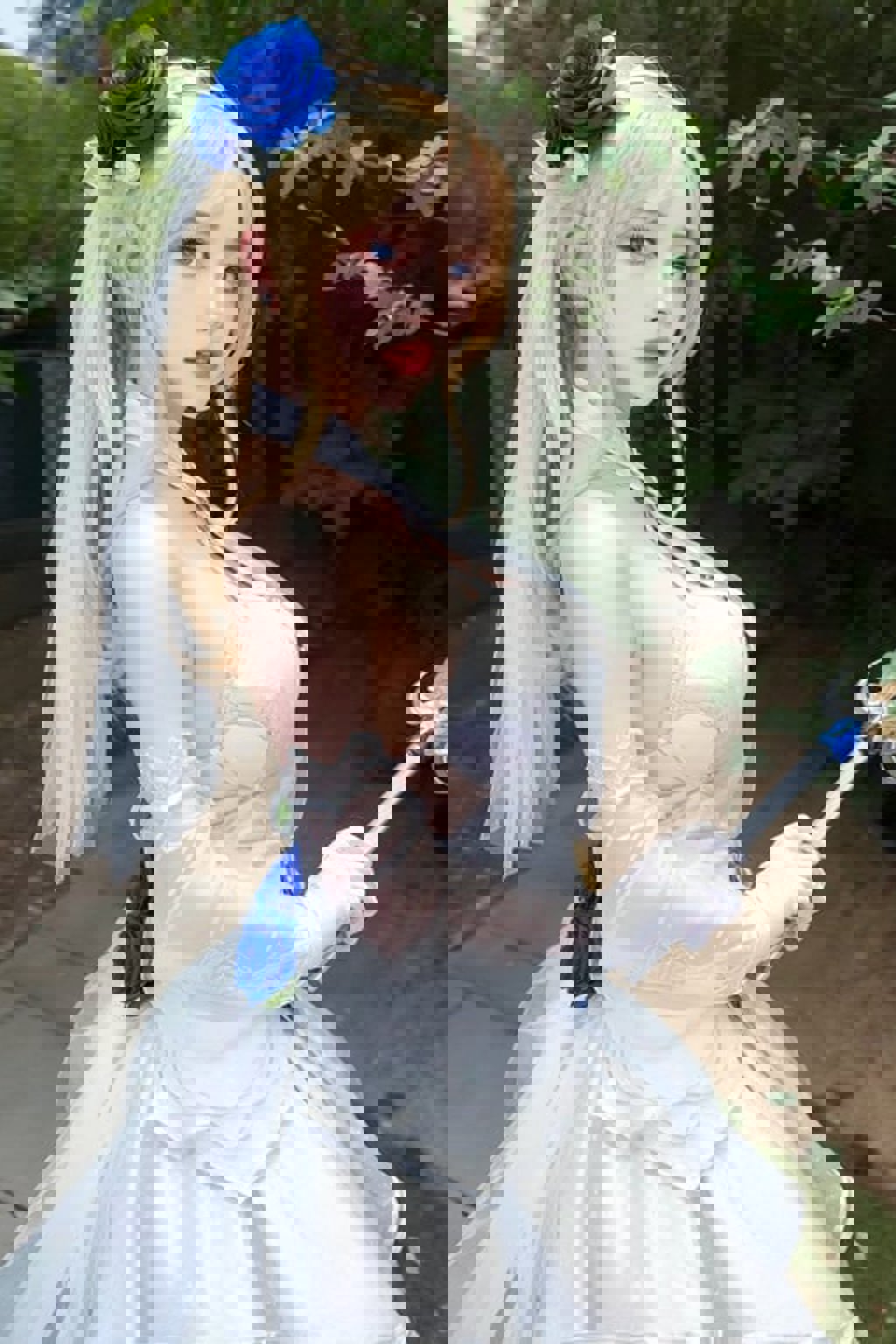 I recommend using these tags:blue_flower, blue_rose, rose, blue_flower, bridal_veil, wedding_dress, white_dress, gloves, white_legwear,blue_eyes
