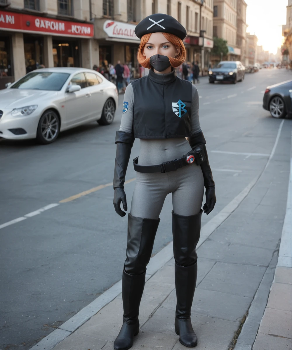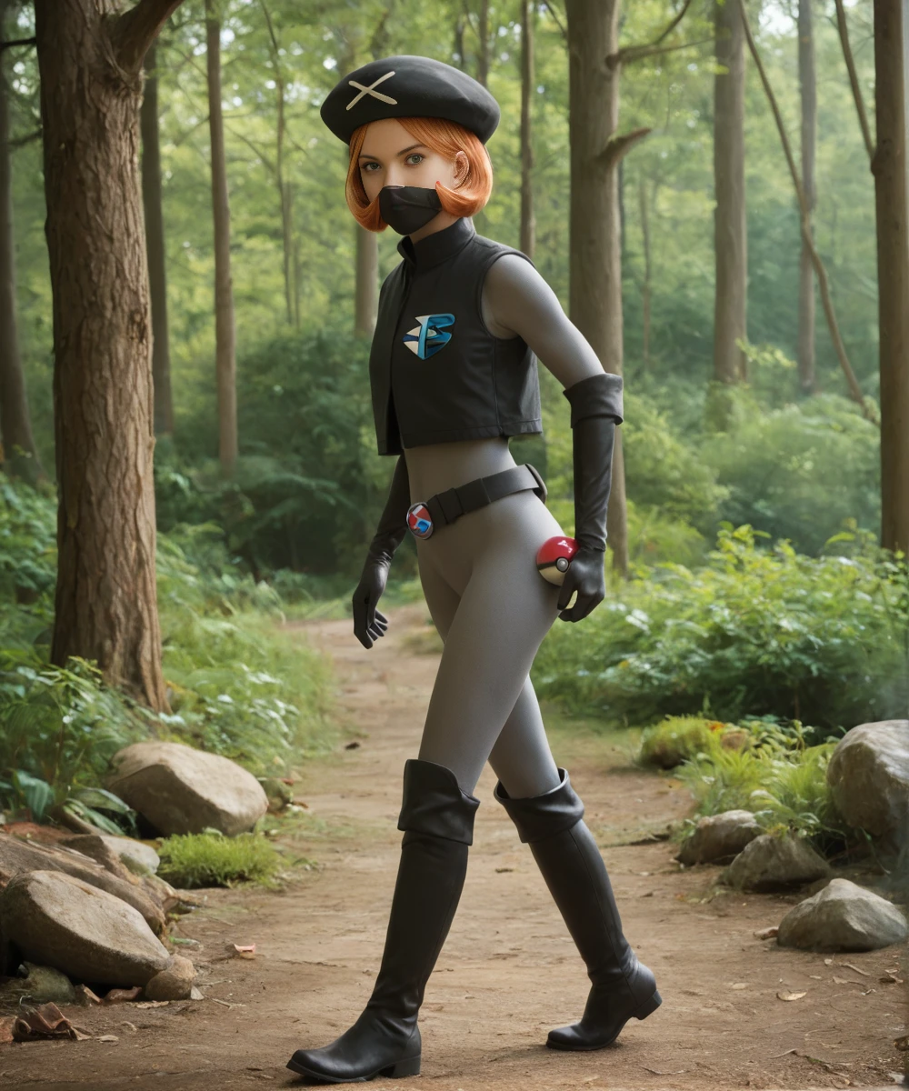evilyteamplasmaaldith, hat, solo, 1girl, orange hair, short hair, poke ball, gloves, belt, blue eyes, vest, elbow gloves, logo, boots, mask, skin tight
