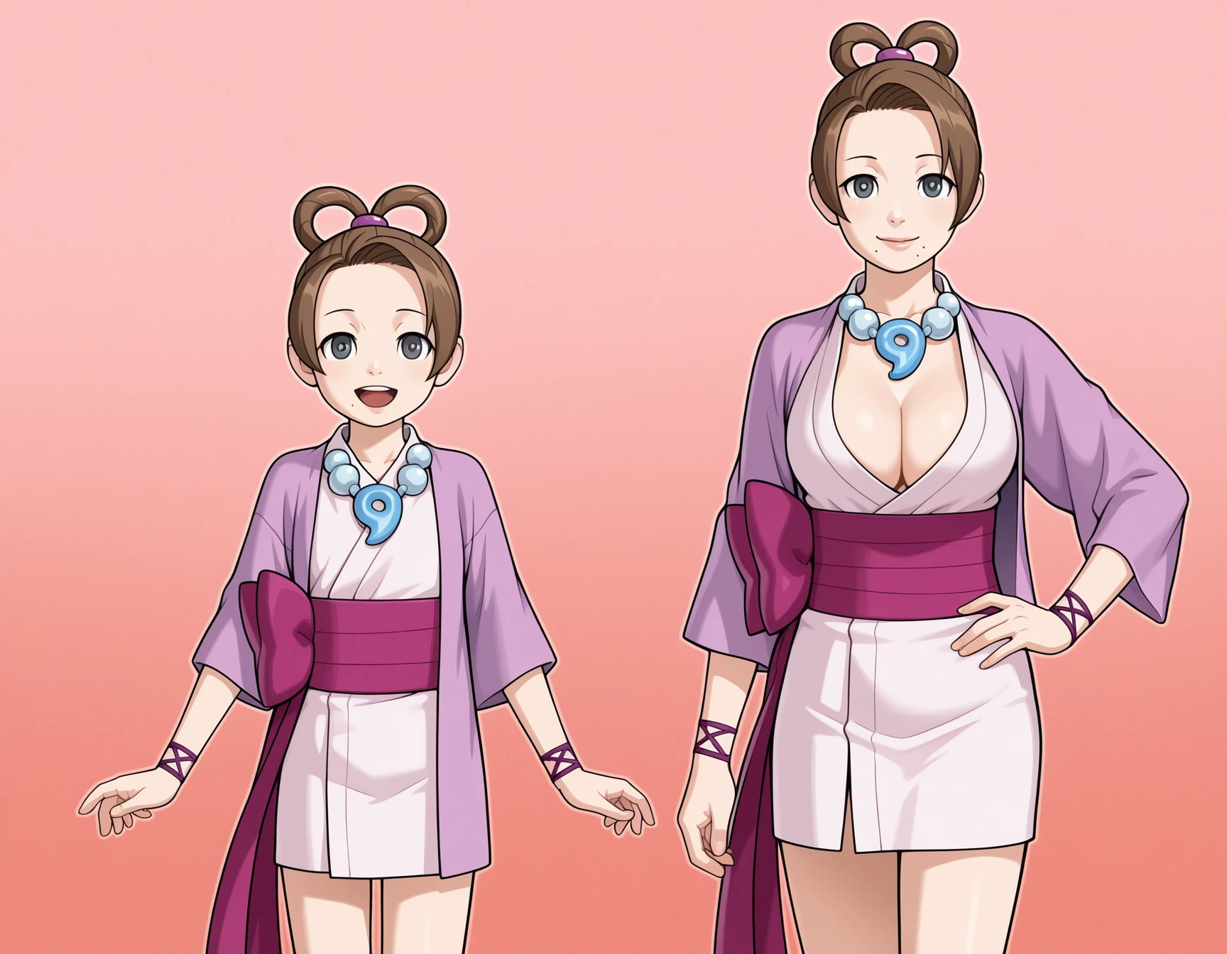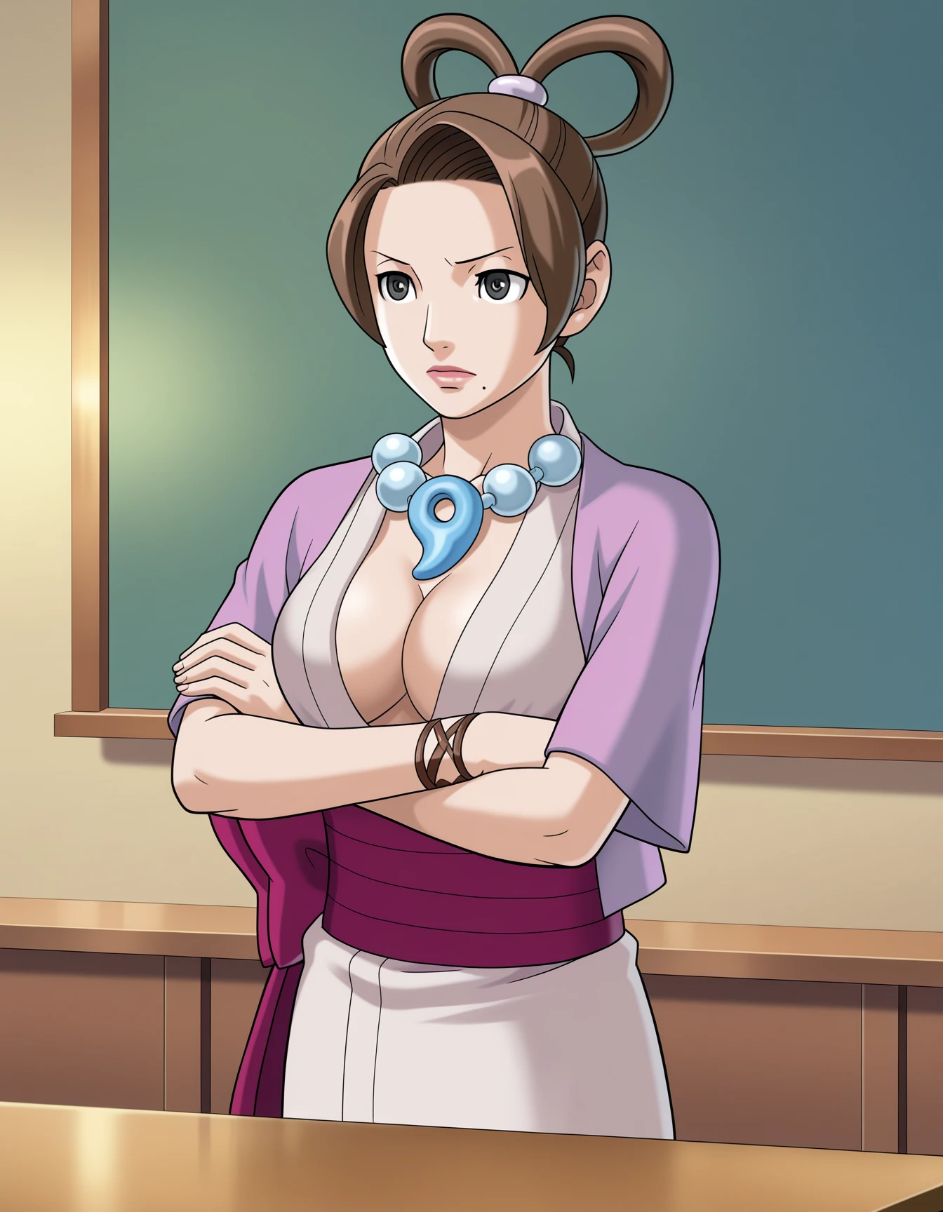Channeled Mia Fey: channeled mia, mia fey, grey eyes, large breasts, hair rings, short hair, mole under mouth, mature female, lips, shouzoku outfits, magatama necklace, short haori, short kimono, cleavage, obi, bracelet,