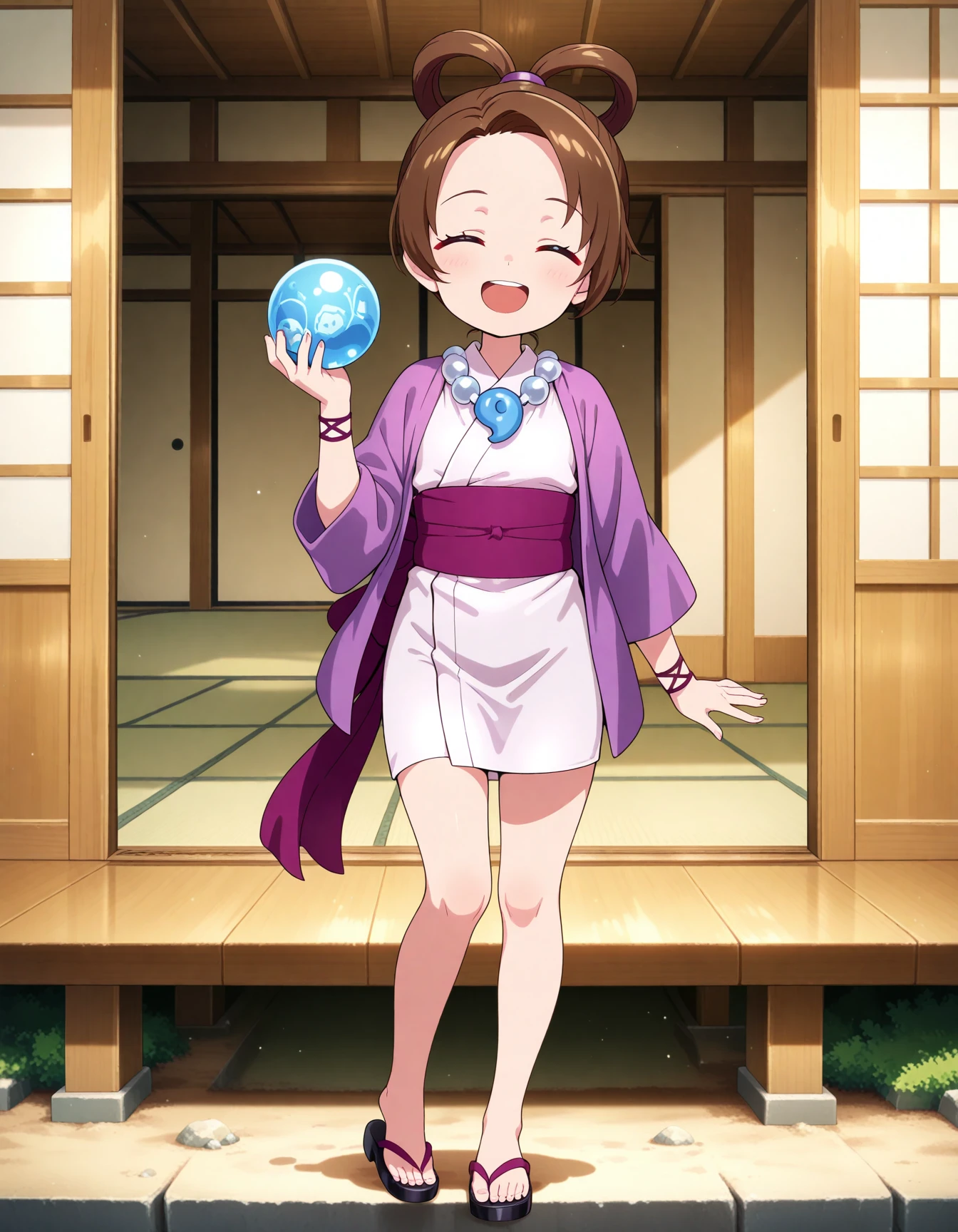 Pearl Fey(child): pearl fey, child, grey eyes, flat chest, hair rings, short hair, shouzoku outfits, magatama necklace, haori, kimono, obi, bracelet, sandals,