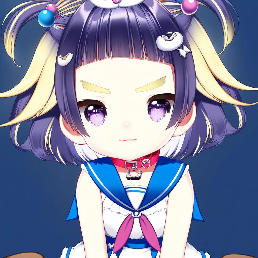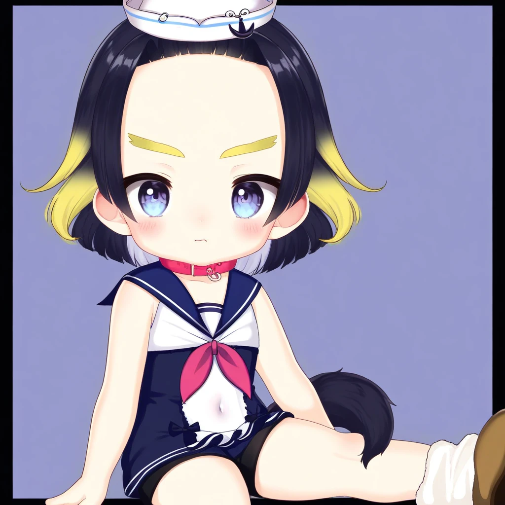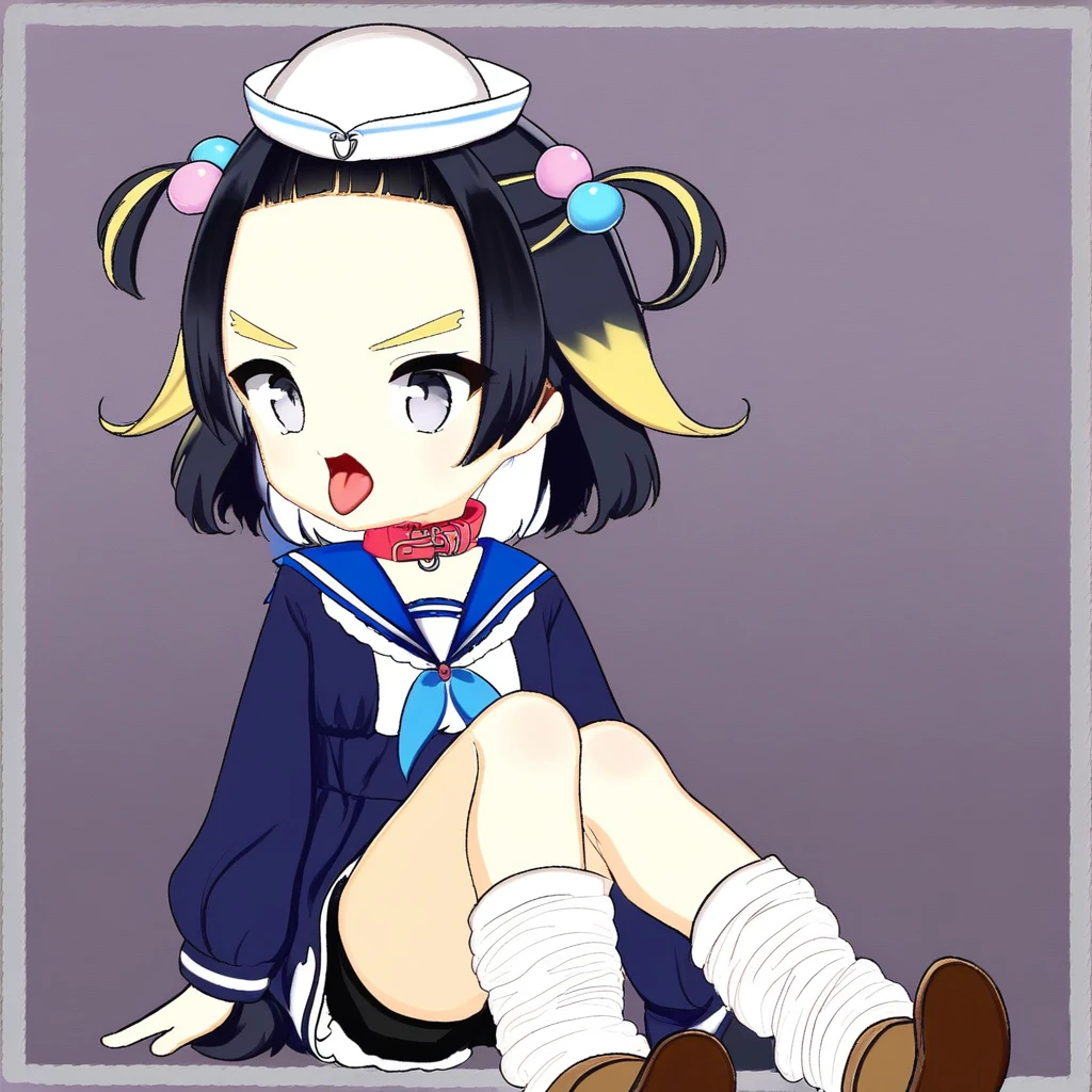 1girl, human, shortstack, skinny, thin, flat chested, small hips, blueish grey eyes, black hair with yellow side tips, blunt bangs, short hair, yellow eyebrows, sleeves sailor top, skirt, black short compression shorts, high white socks, black mary janes, hair beads, hair accessories