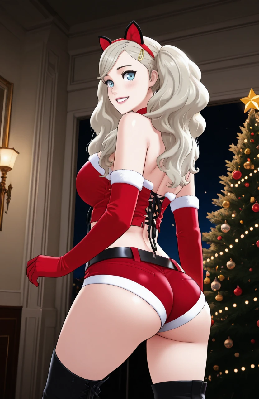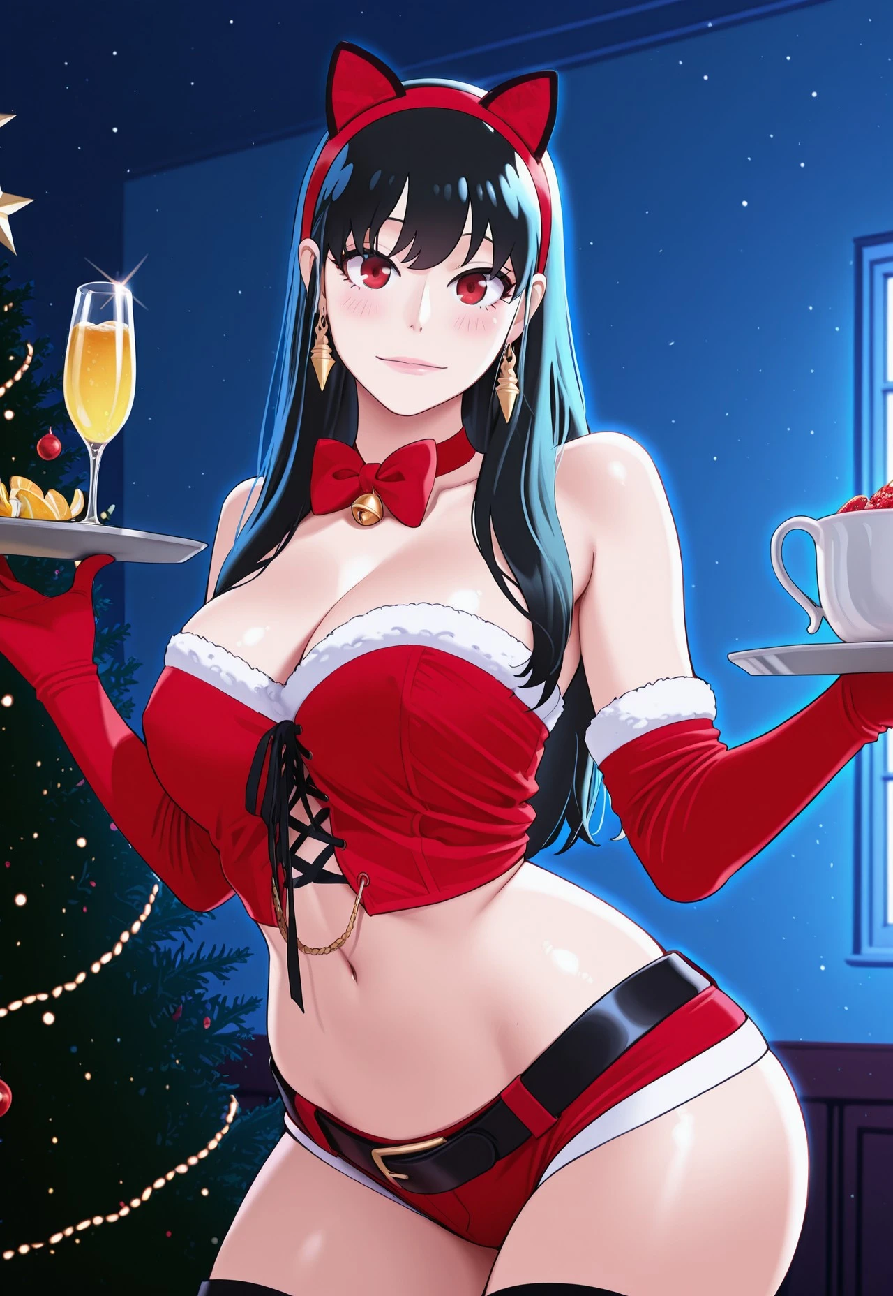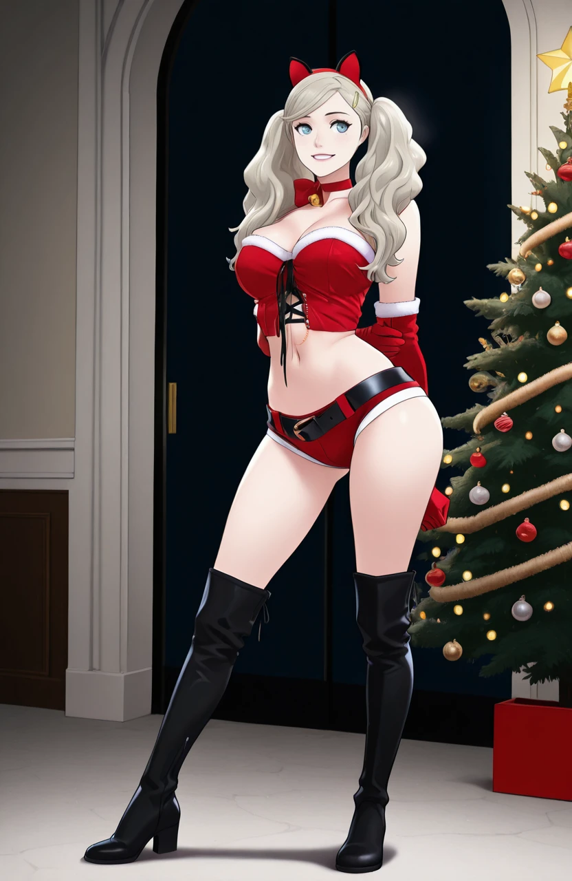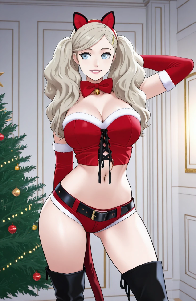 cat ears hairband, bow choker, red crop top, lace-up top, white fur trim, red micro shorts, black belt, red elbow gloves, black thigh-high boots, fake tail,