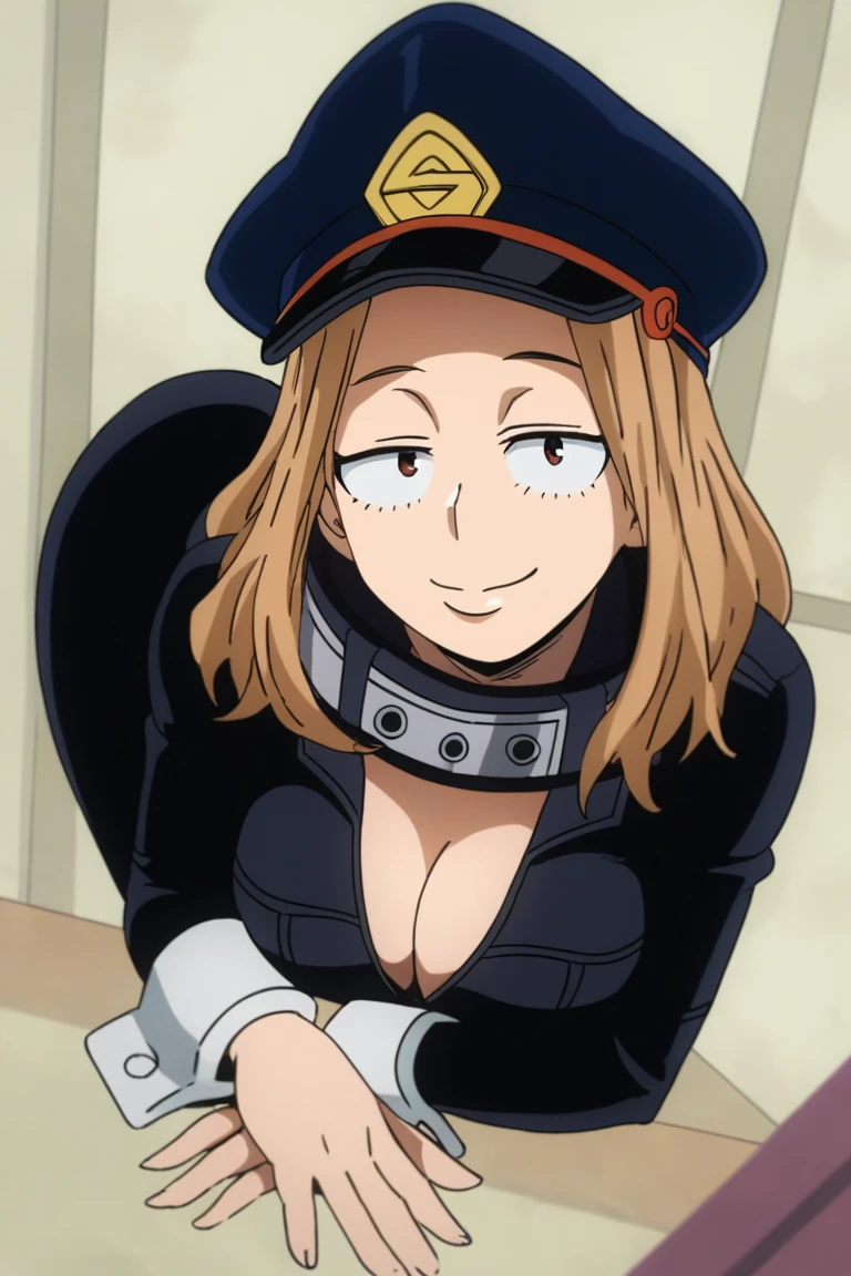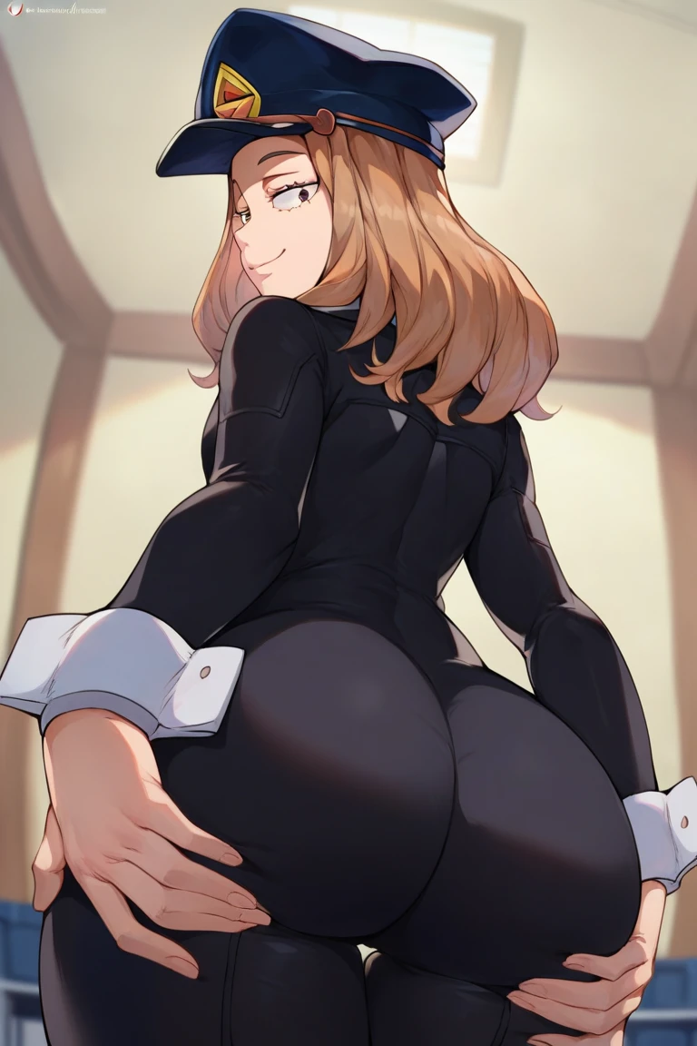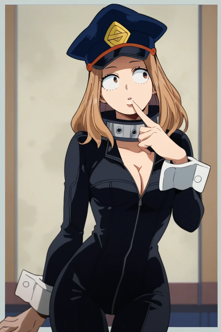 peaked cap, black bodysuit, wrist cuffs, white footwear, high heel boots