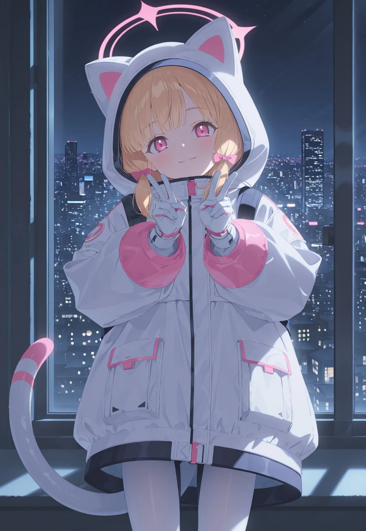 MomoiBattle, halo, blonde hair, fake animal ears, hood, tail, white jacket, pink eyes, white pantyhose, gloves, cat tail, long sleeves,
