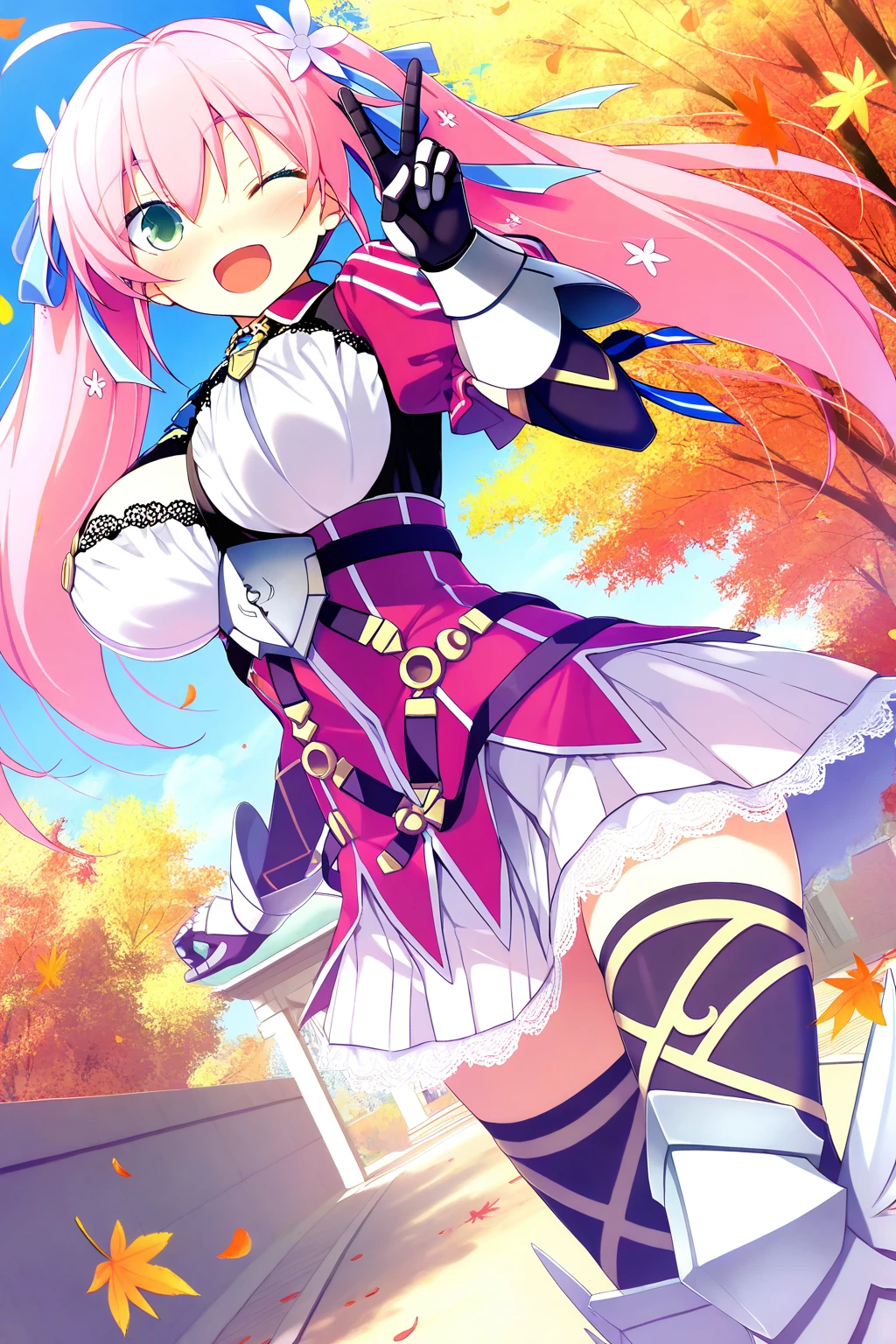 hibi_rrk, 1girl, solo, green eyes, pink hair, long hair, twintails, ahoge, large breasts, hair flower, hair ribbon, blue ribbon, red collar, lace-trimmed dress, blue brooch, puffy sleeves, cleavage, multiple belts, armor, gauntlets, white skirt, pleated skirt, black thighhighs, wing-shaped greaves, silver armored boots,