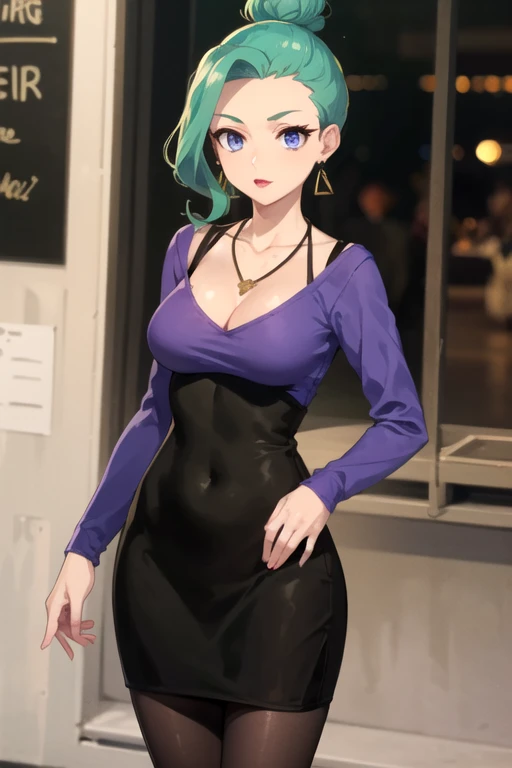 RaburaChichibu, 1girl, solo, blue eyes, long sleeves, purple shirt, black dress, cleavage, jewelry, medium breasts, pantyhose, earrings, green hair, necklace, single hair bun, lipstick, hoop earrings,