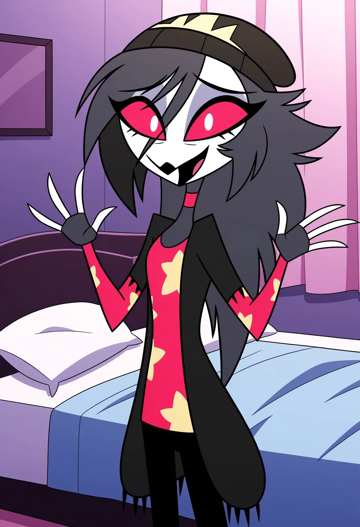 octaviaHB, beak, colored sclera, pink sclera, white pupils, black hair, long hair, beanie, pink choker, black cardigan, long sleeves, hat, black leggings