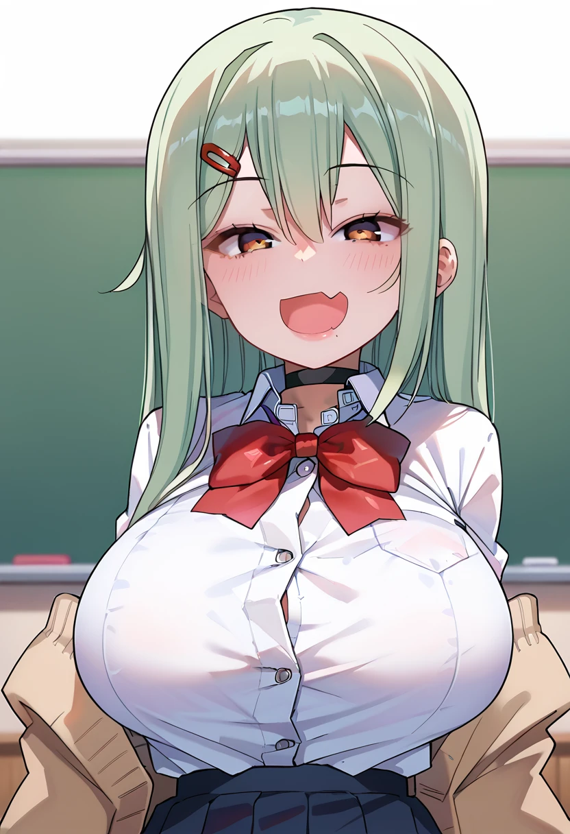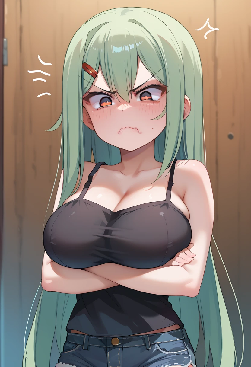 sorakomozu, brown eyes, black pupils, long hair, hairclip, huge breasts, short, short stature, Negative Prompt