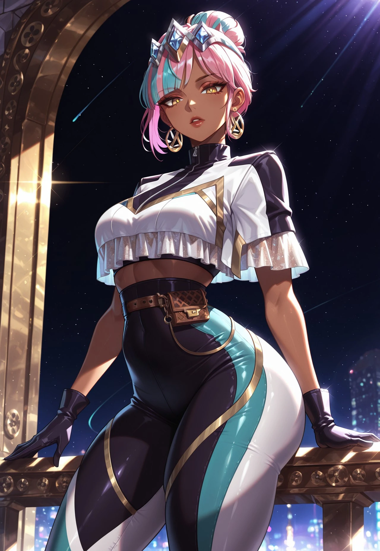 PTDqiyana,pink hair,multicolored hair,blue strand,short hair,hair ornament,hair bun,earrings,yellow eyes,gloves,cut top,midriff,multicolored pants,skintight pants,,