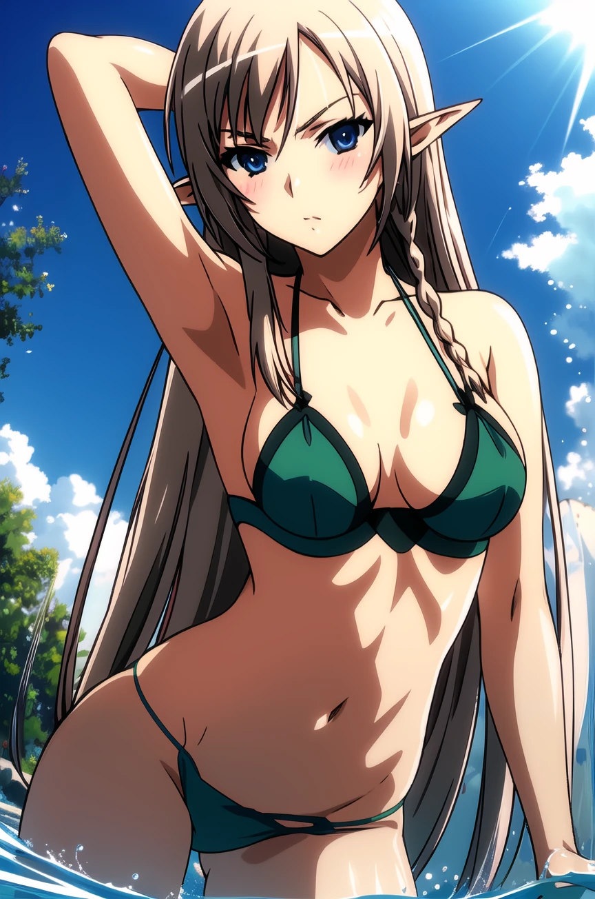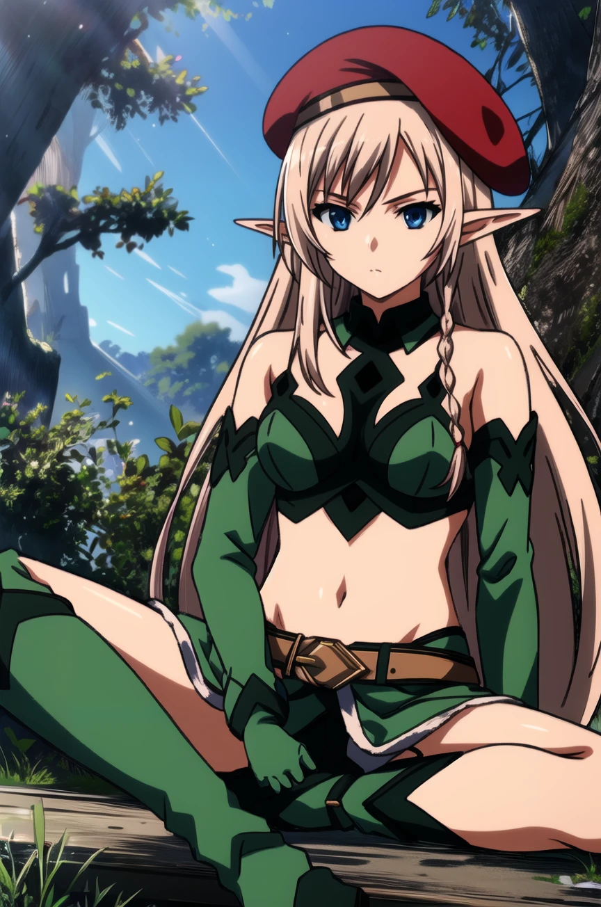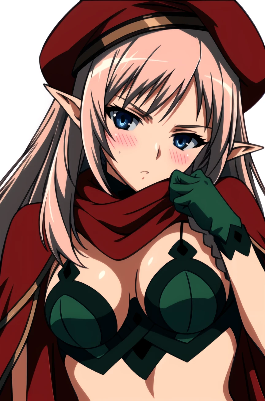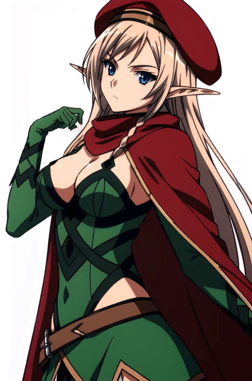 queen-alleyne, 1girl,elf, mature female, solo, long hair, blonde hair, blue eyes,medium breasts, pointy ears,green glove, green footwear,(red beret), red cape,