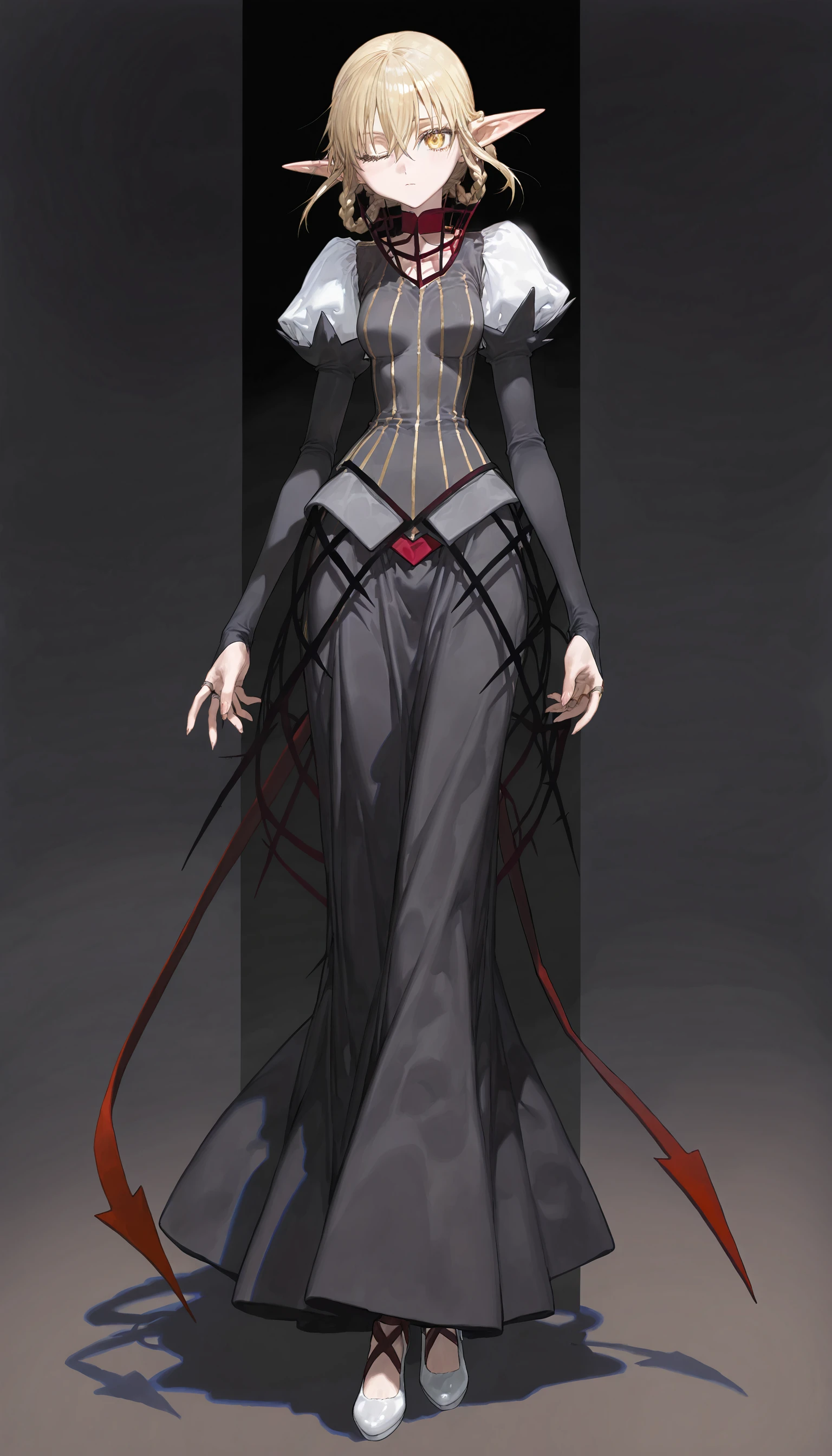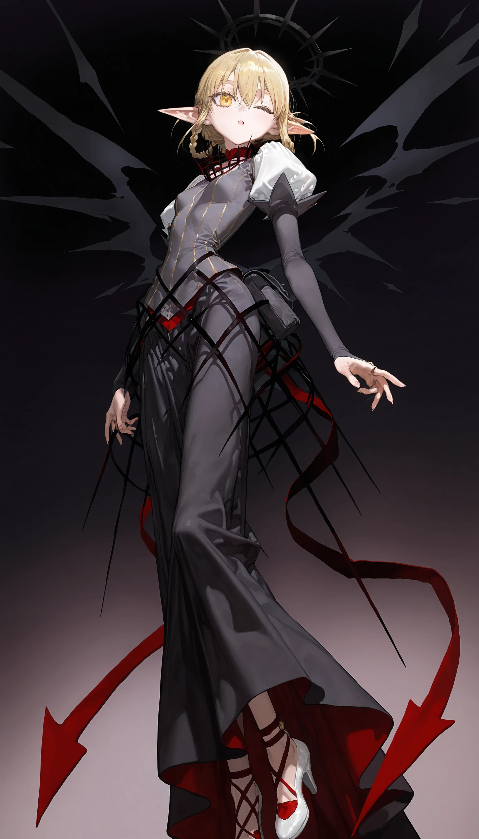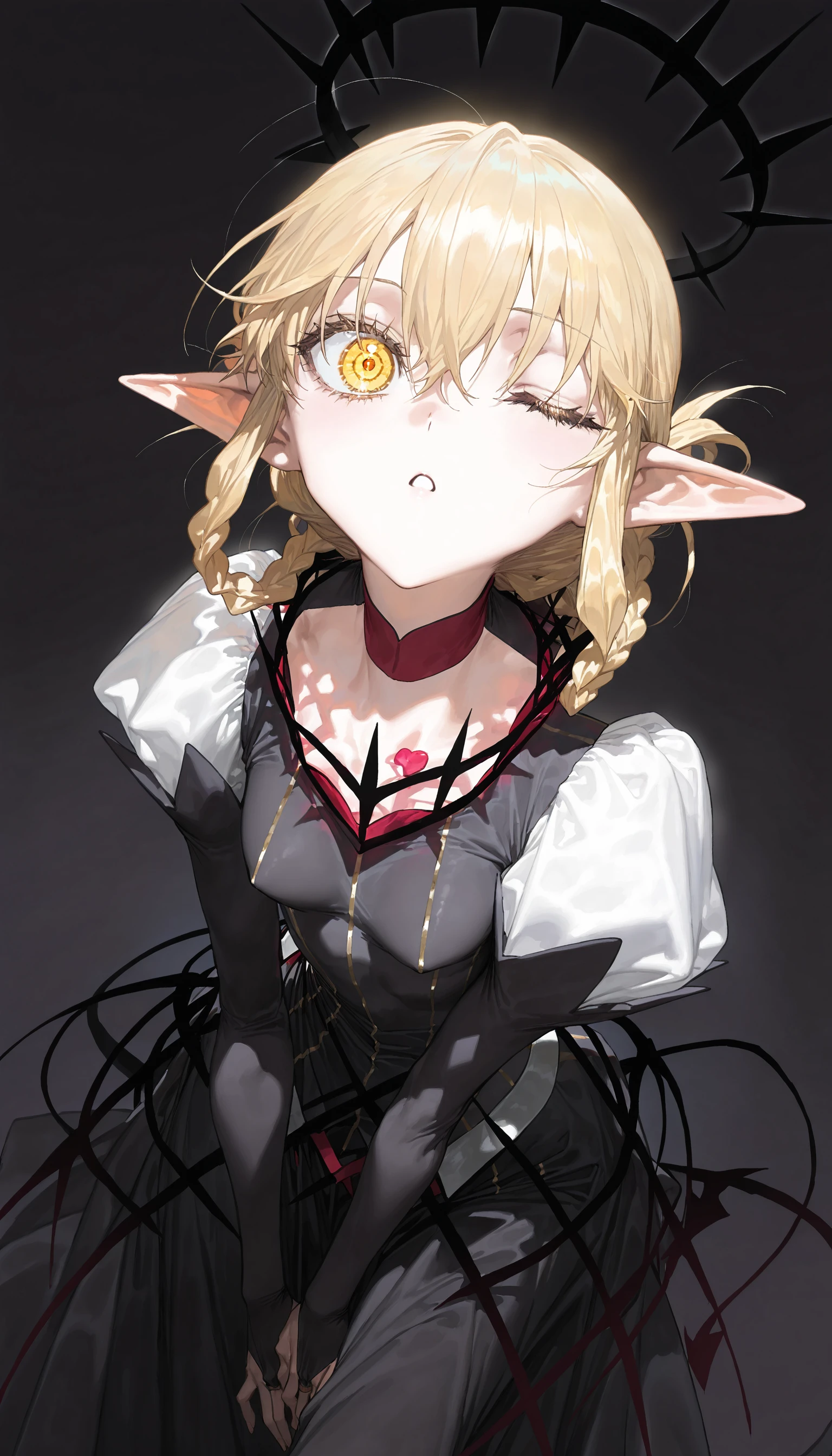 Rurutia_Theking , one eye closed ,blonde hair,pointy ears,elf,twin braids ,yellow eyes,