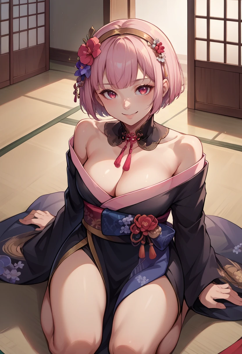 MoriNewYears, hair flower, hair ornament, short hair, detached collar, black kimono, bare shoulders, sash