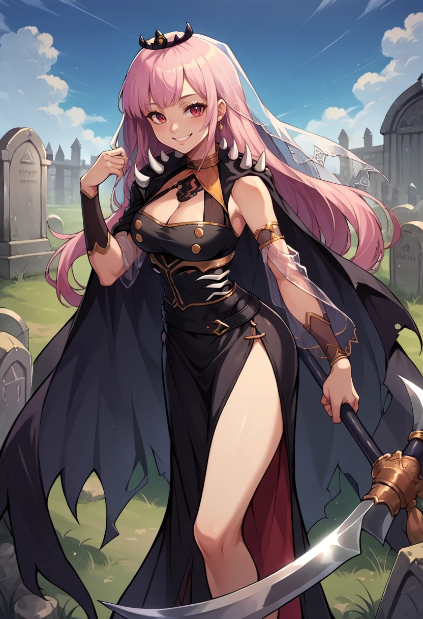 MoriBase, long hair, veil, tiara, long black sleeveless dress, cleavage, side slit, torn black cape, shoulder spikes, single black thighhigh, detached sleeves, see-through sleeve