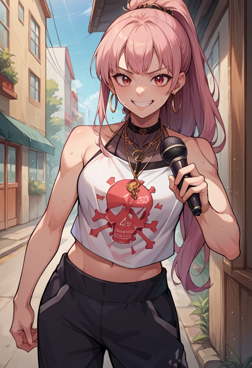 MoriStreetwear, long hair, ponytail, necklace, hoop earrings, white halter shirt, sleeveless, skull print, midriff, black sweatpants