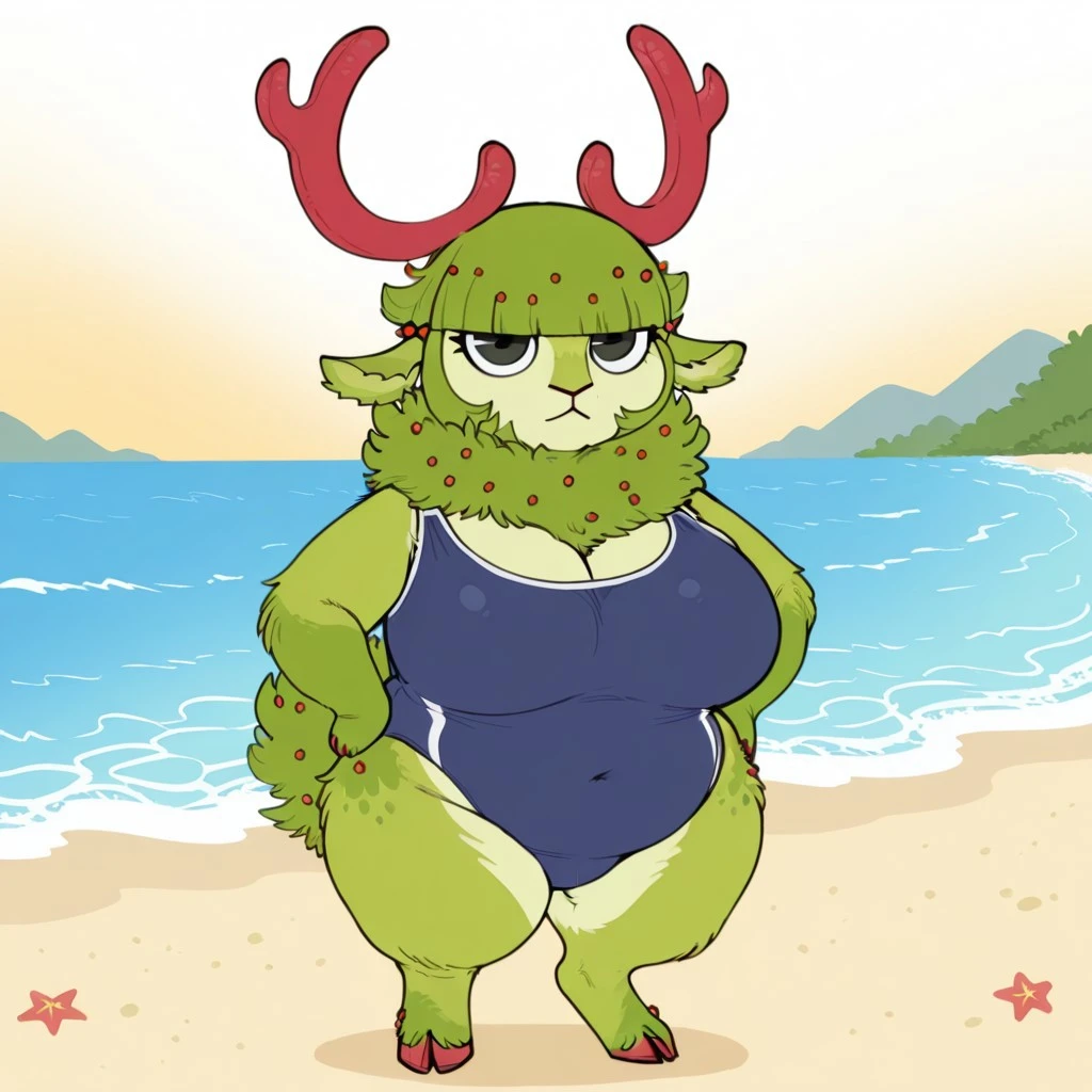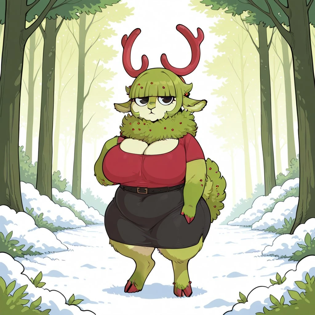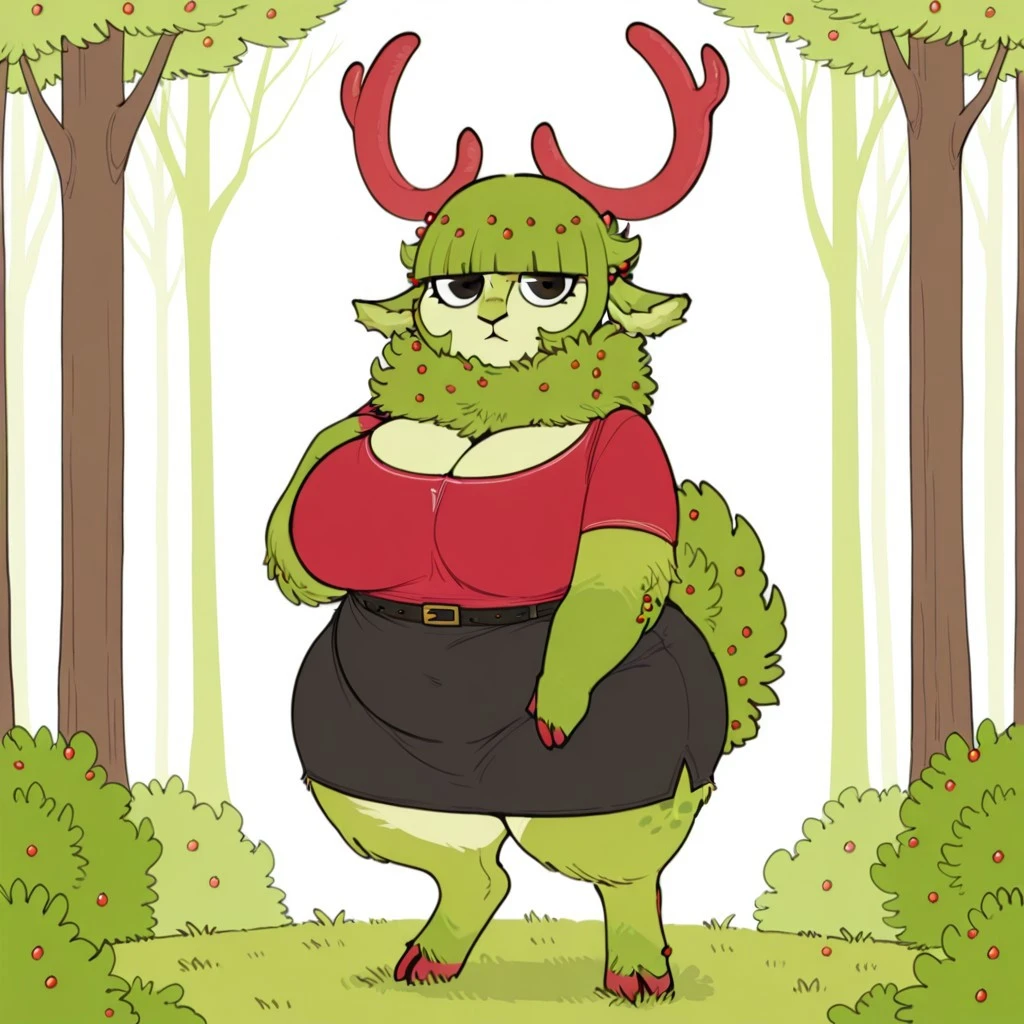 deer, reindeer, green fur, green hair, short hair, blunt bangs, black eyes, red antlers, deer ears, red deer hooves, large deer tail, chubby, plump, large breasts, wide hips,