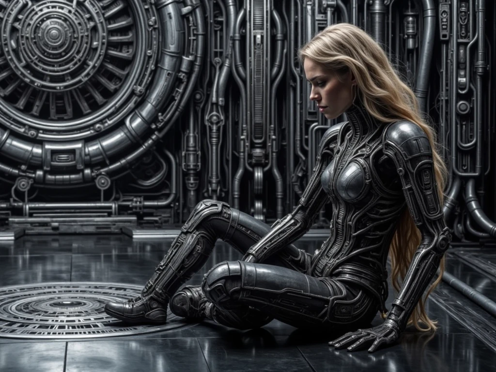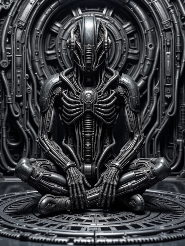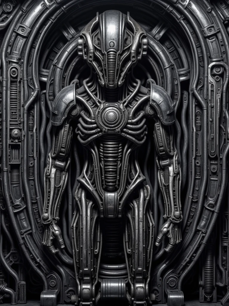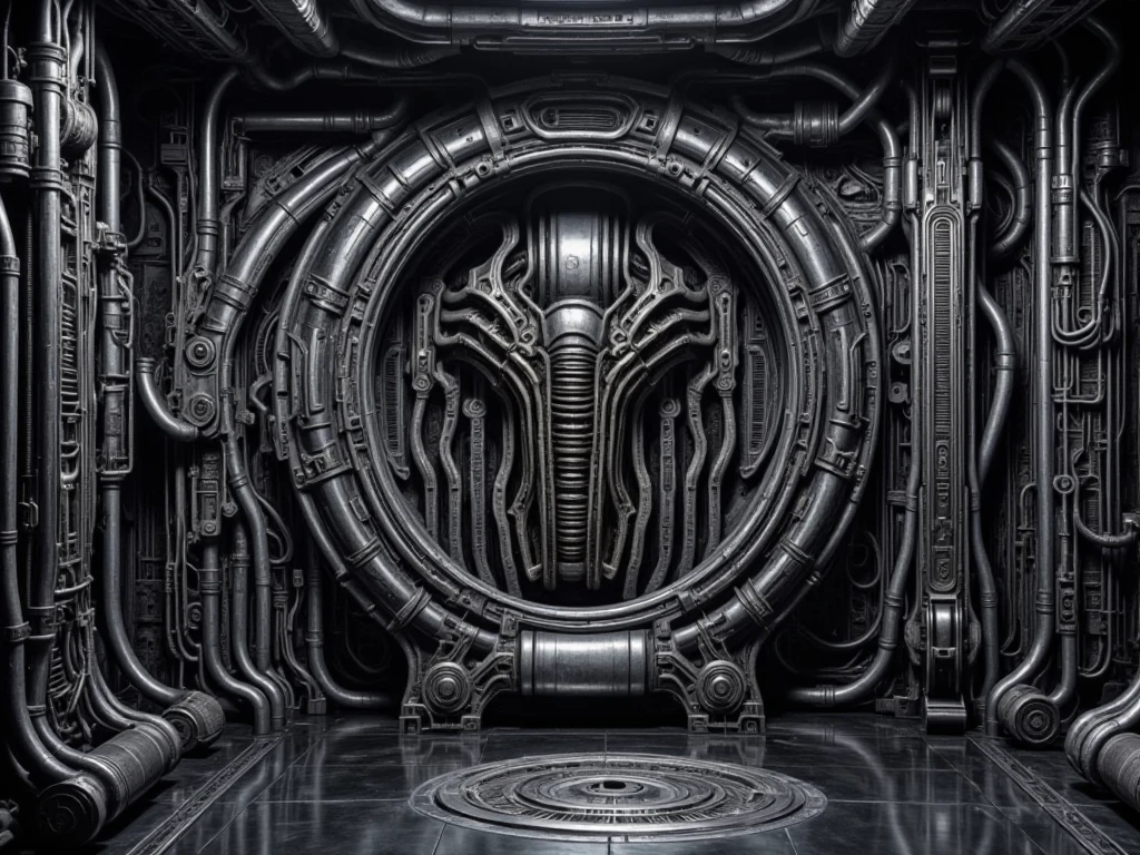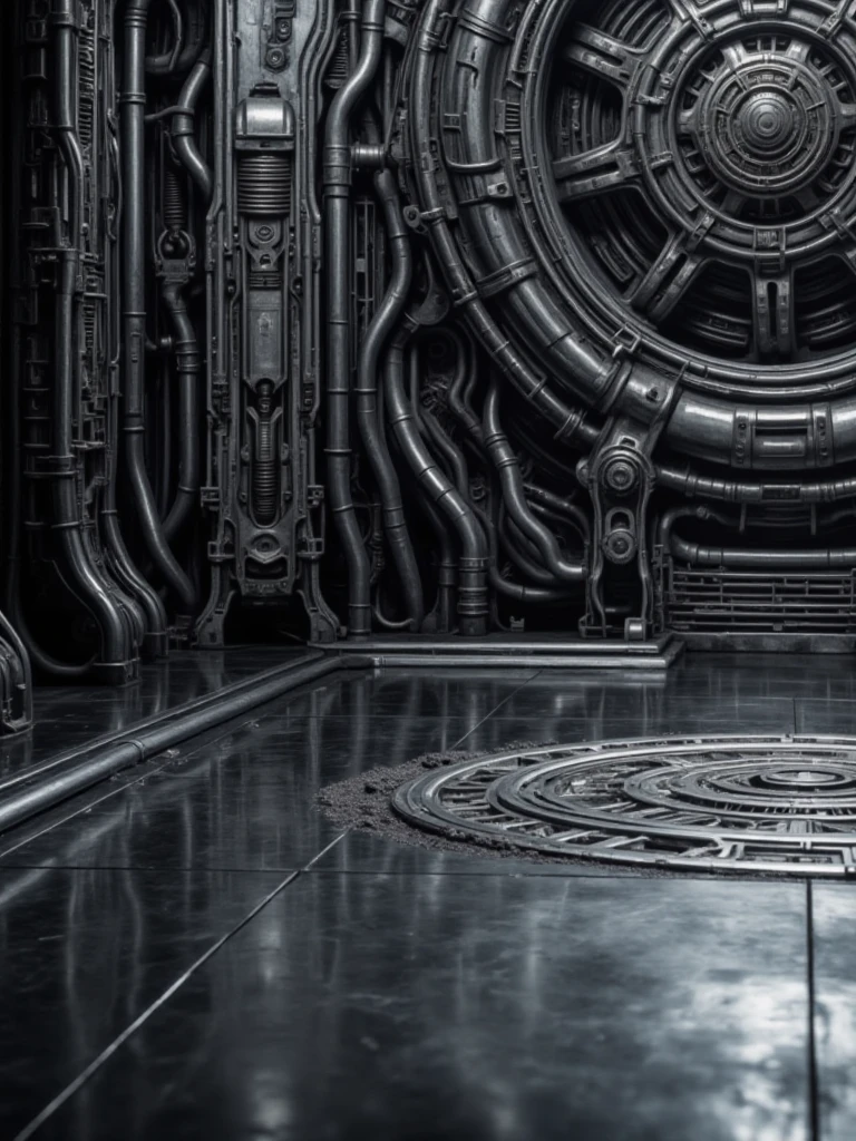Alien Chamber, biomechanical sci-fi interior environment, fully enclosed alien industrial chamber built from dense mechanical structures, pipes, cables, and ribbed metal architecture. The scene is symmetrical and architectural, with walls, ceiling, and floor covered in integrated tubing, conduits, and biomech machinery. A large circular mechanical structure is embedded in the central wall, resembling a reactor core. Surfaces are metallic, dark steel and gunmetal, with worn industrial textures and high detail density. Cold monochrome lighting enters from overhead apertures, producing strong specular highlights, deep shadows, and high contrast across reflective floors and walls. No characters, no props, pure background environment, cinematic sci-fi, biomechanical, industrial atmosphere