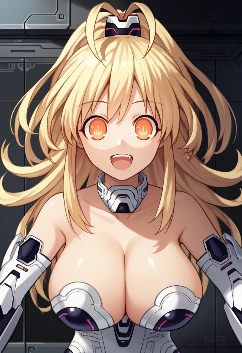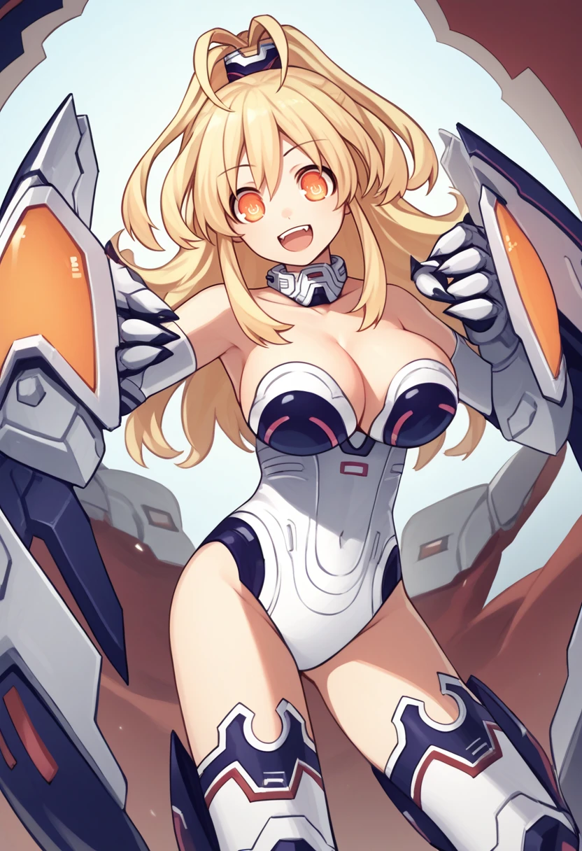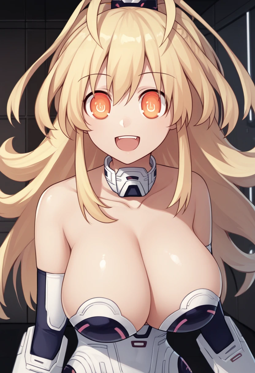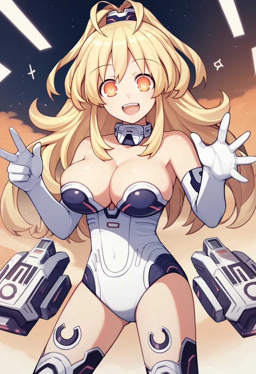 yllwhrt, orange eyes, symbol-shaped pupils, power symbol, blonde hair, long hair, antenna hair, leotard, detached collar, cleavage, elbow gloves, thighhighs