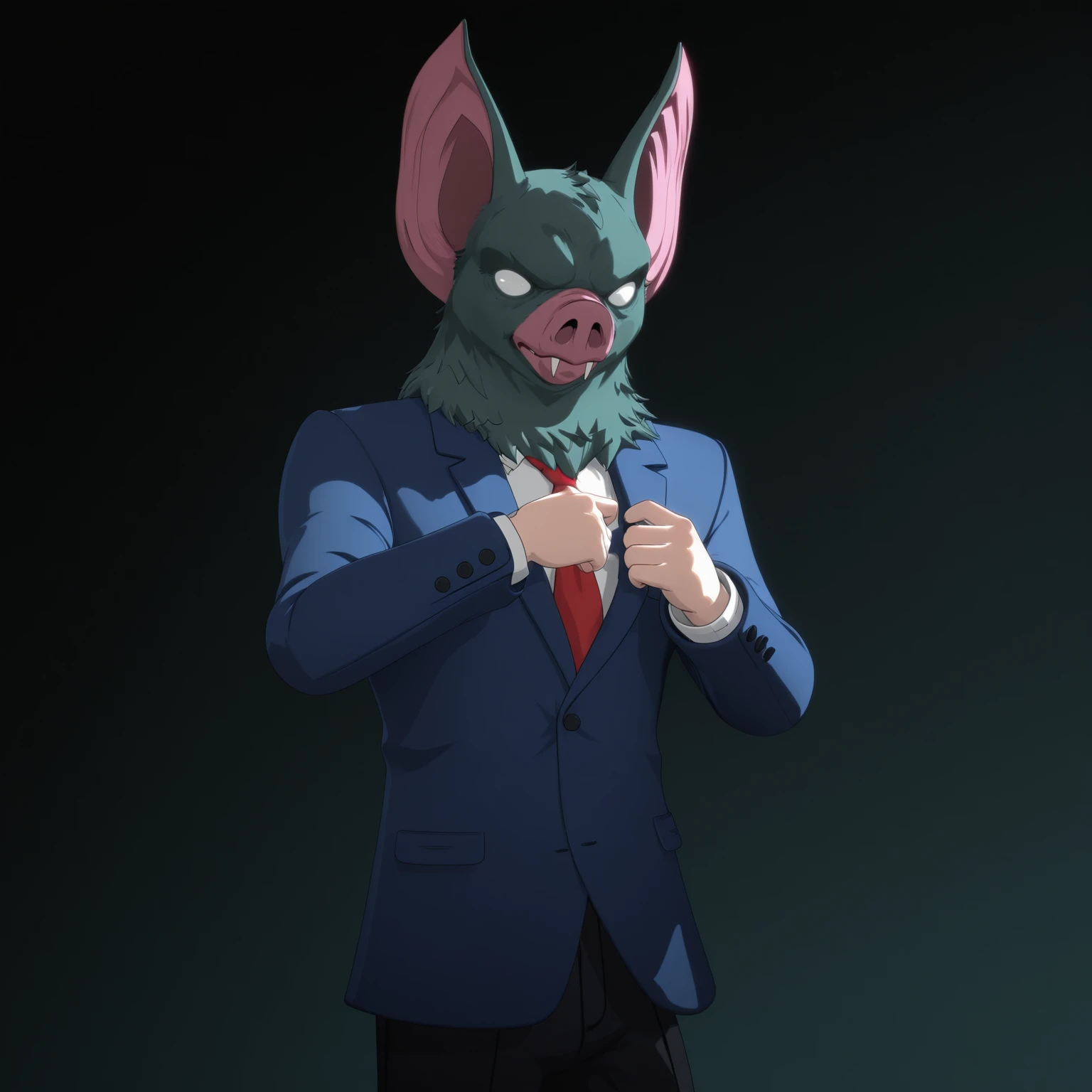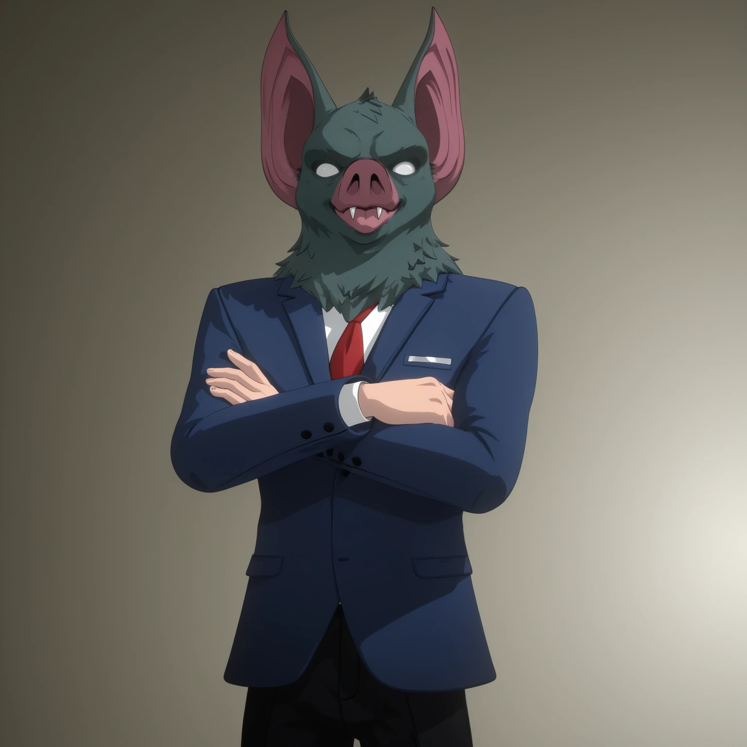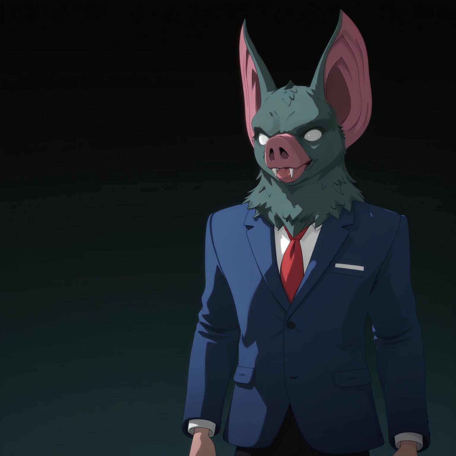 1boy, male, humanoid, hybrid, bat, solo, grey fur, white eyes, no pupils, pink snout, nostrils, fangs, bat ears, pointed ears