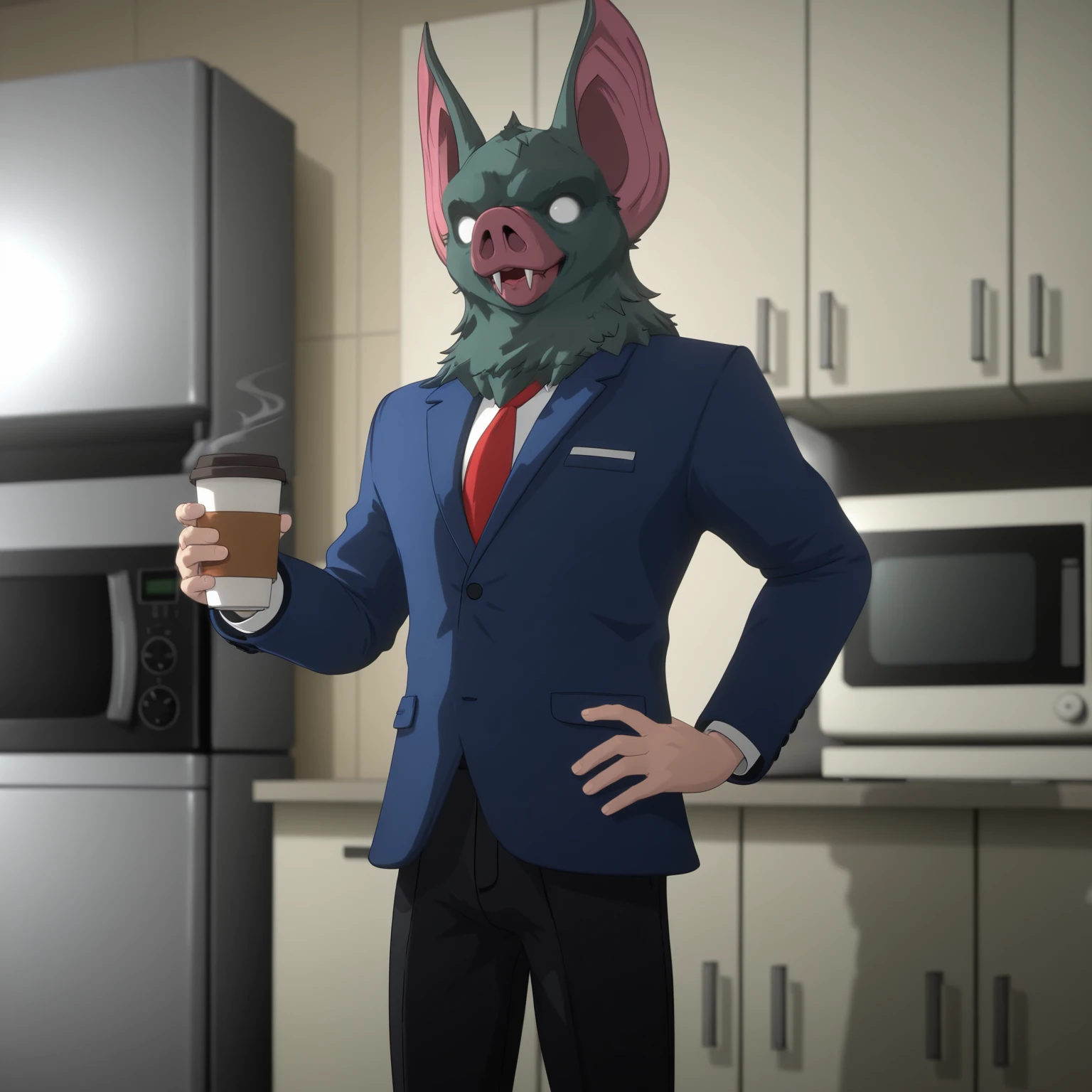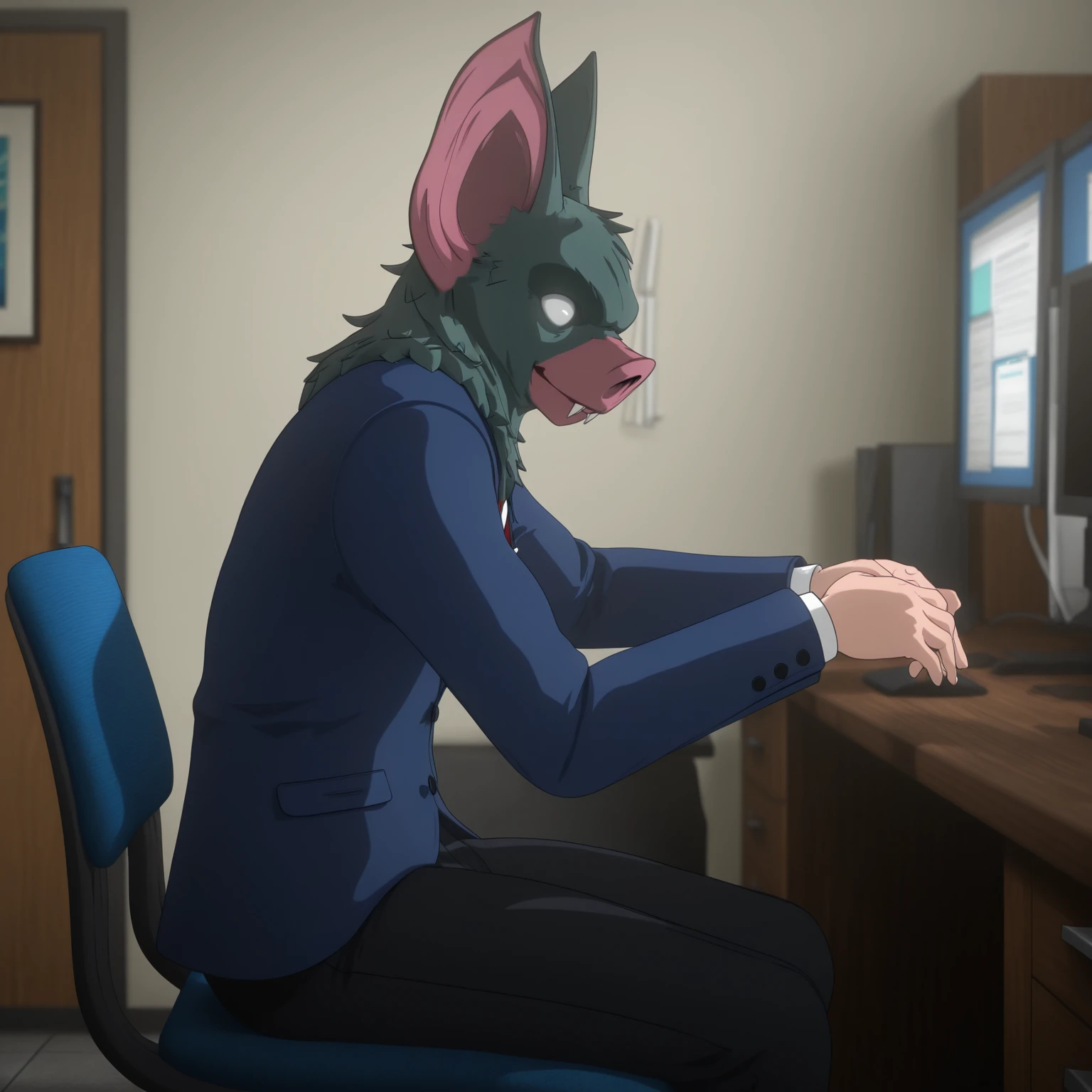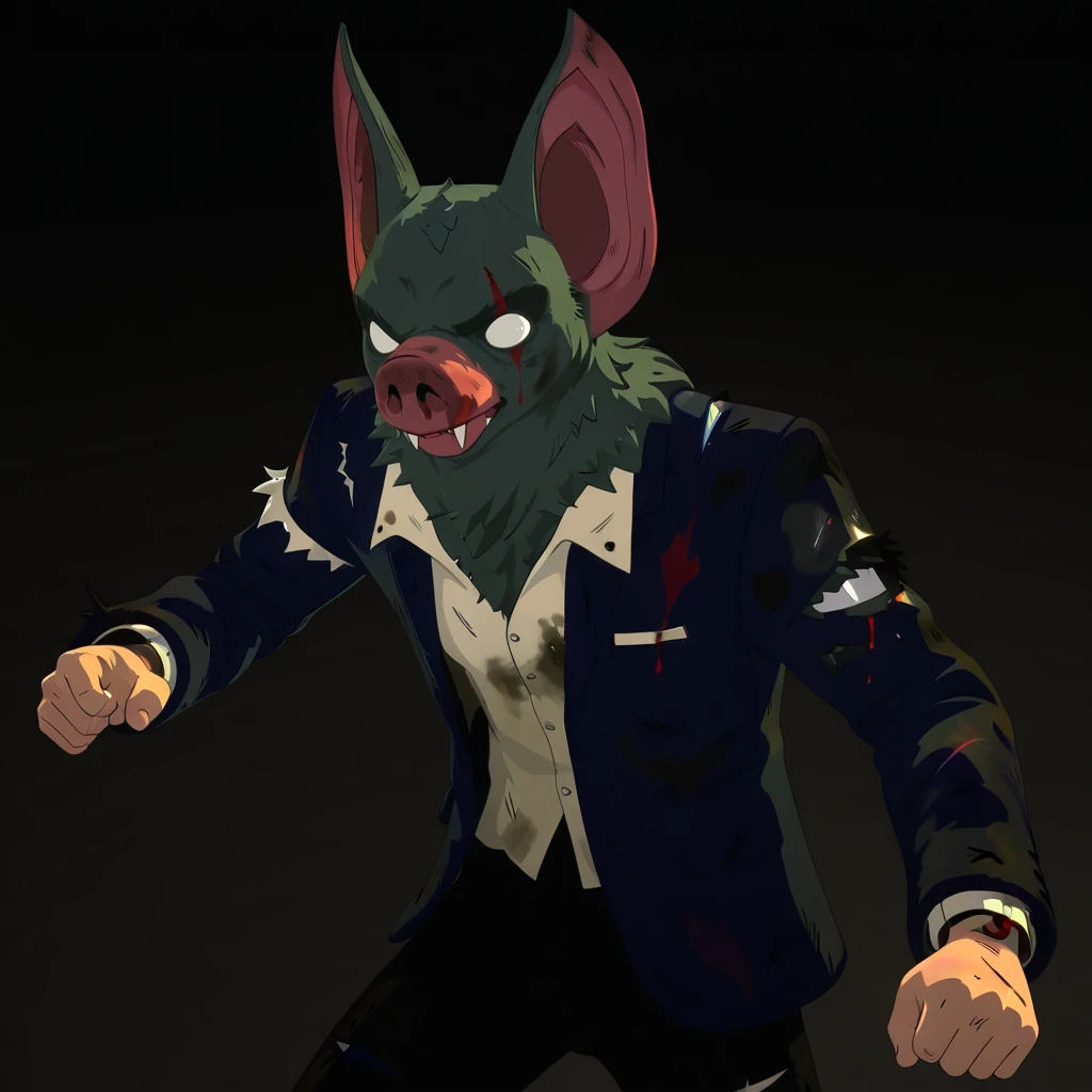 1boy, male, humanoid, hybrid, bat, solo, grey fur, white eyes, no pupils, pink snout, nostrils, fangs, bat ears, pointed ears
