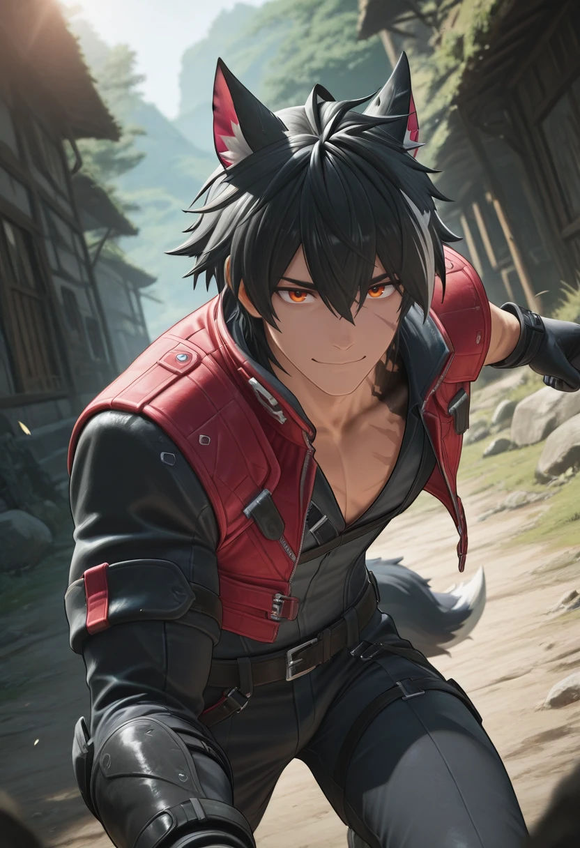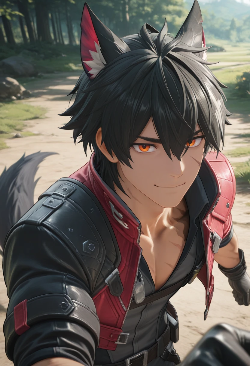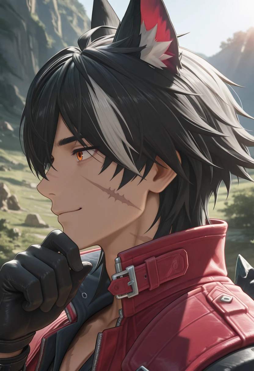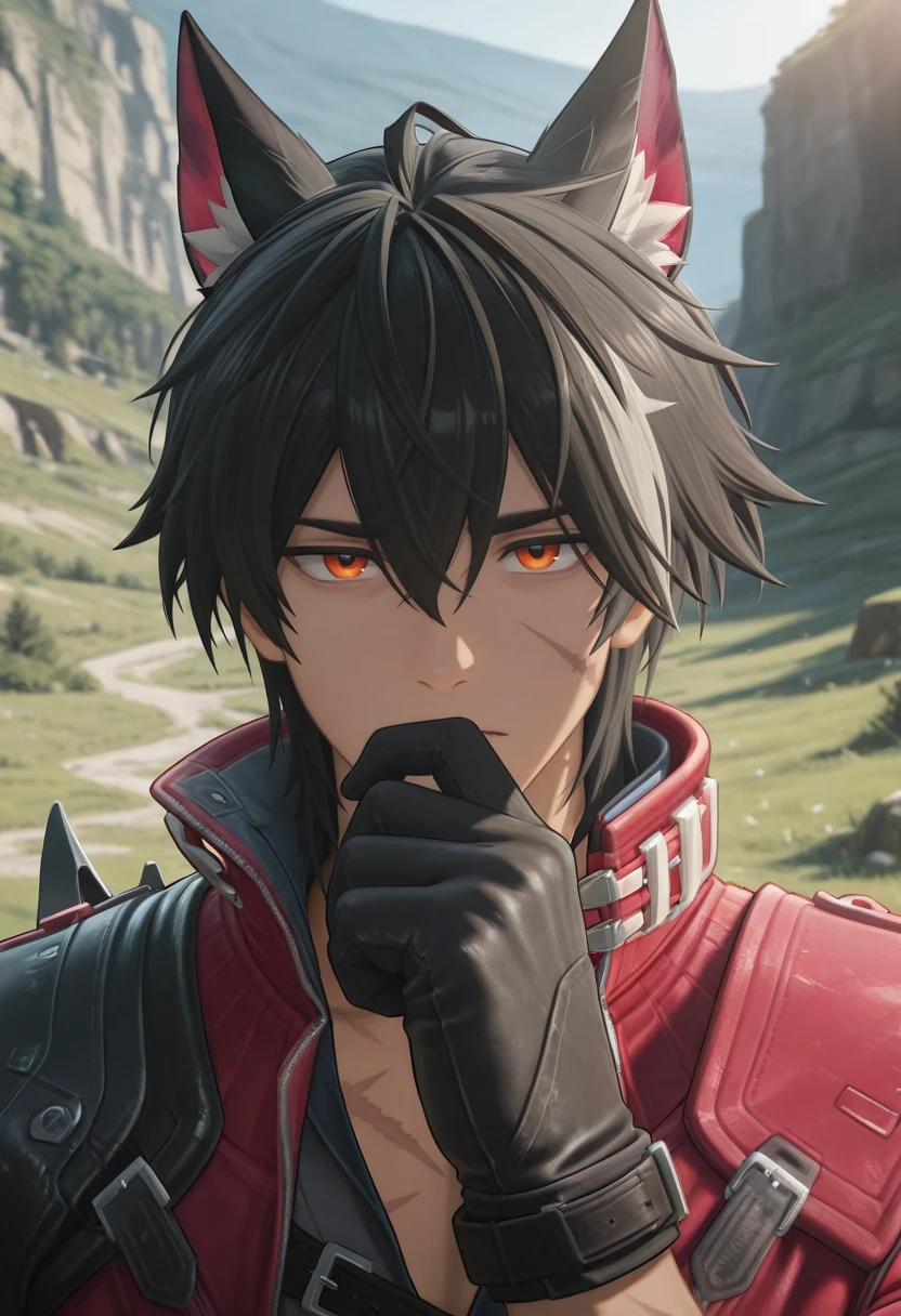 wulfgard, black hair, wolf ears, hair between eyes, multicolored hair, orange eyes, scar on face, wolf tail, red jacket, gloves, black gloves, short sleeves, belt,