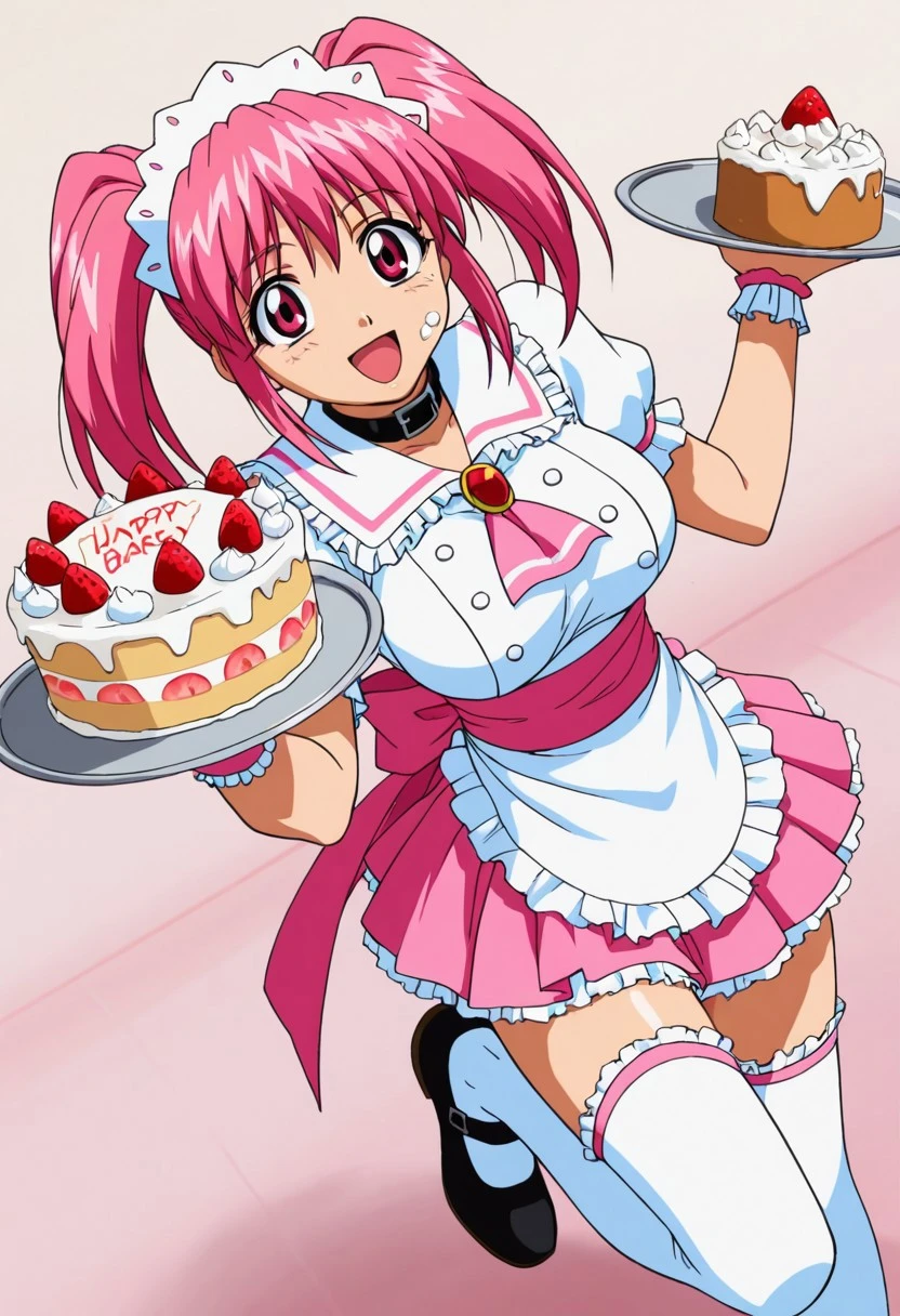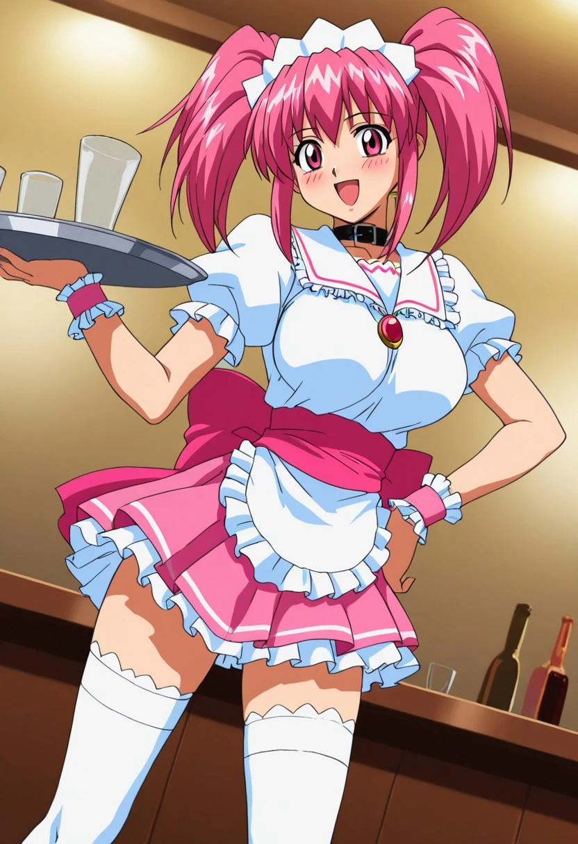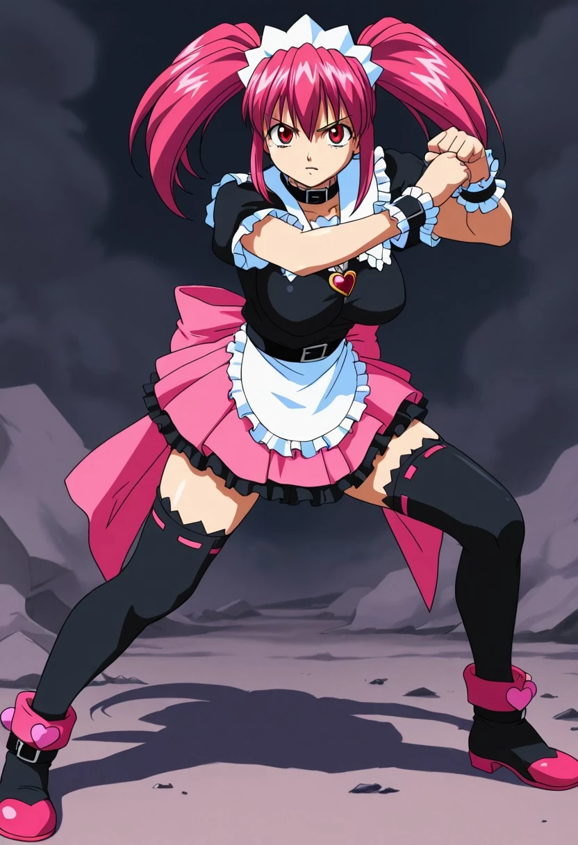 waitress, maid headdress, black belt collar with black frills, pink sash with back ribbon, pink pleated miniskirt with black frills, frilled sailor collar with hearth brooch, pink frilled puffy short sleeves, black frilled waist apron, pom pom (clothes), frilled cuffs, frilled black thighhighs, black with pink accents ankle boots with pink heart,