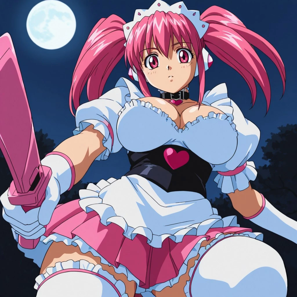Outfit 02 : maid headdress, black belt collar with white frills, robot ears,white frilled puffy short sleeves, white elbow gloves with pink accents and pink heart on sleeve, front waist heart accessory, cleavage, underbust corset, pink pleated miniskirt, frilled white thighhighs with pink accents, white with pink accents ankle boots with pink heart,