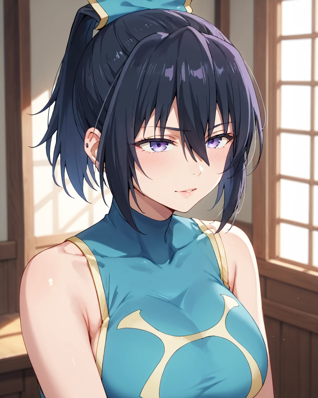 Anemone, black hair, lavender eyes, breasts, hair between eyes, ponytail, large breasts, short hair, 1girl, solo