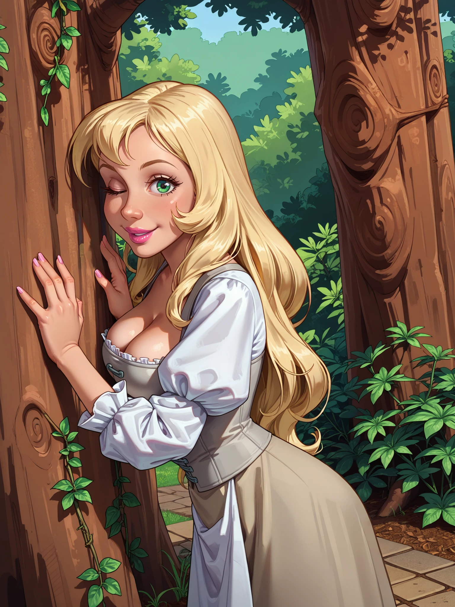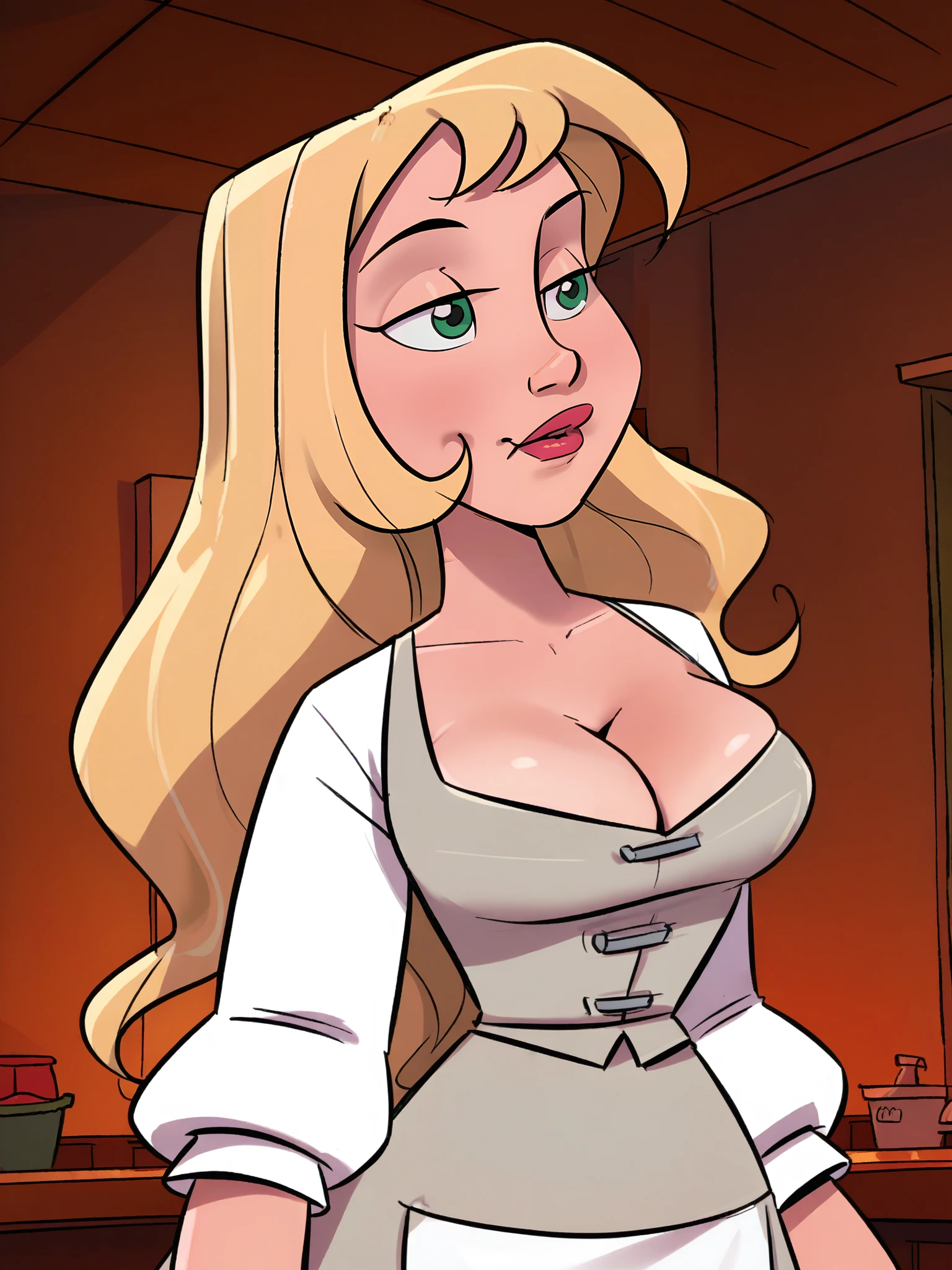 Add-Ons: 1girl, solo, blonde hair, long hair, green eyes, lipstick, tan skirt, apron, white shirt, puffy sleeves, grey corset, medium breasts, cleavage