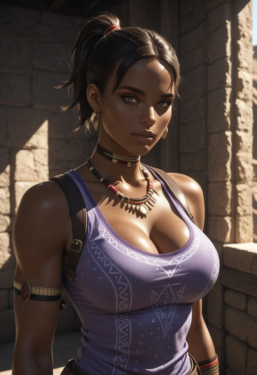 dark skin, sheva alomar , 1girl, dark hair, ponytail, , short hair, ,purple tank top, big breasts, cleavage