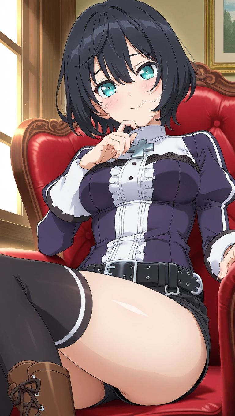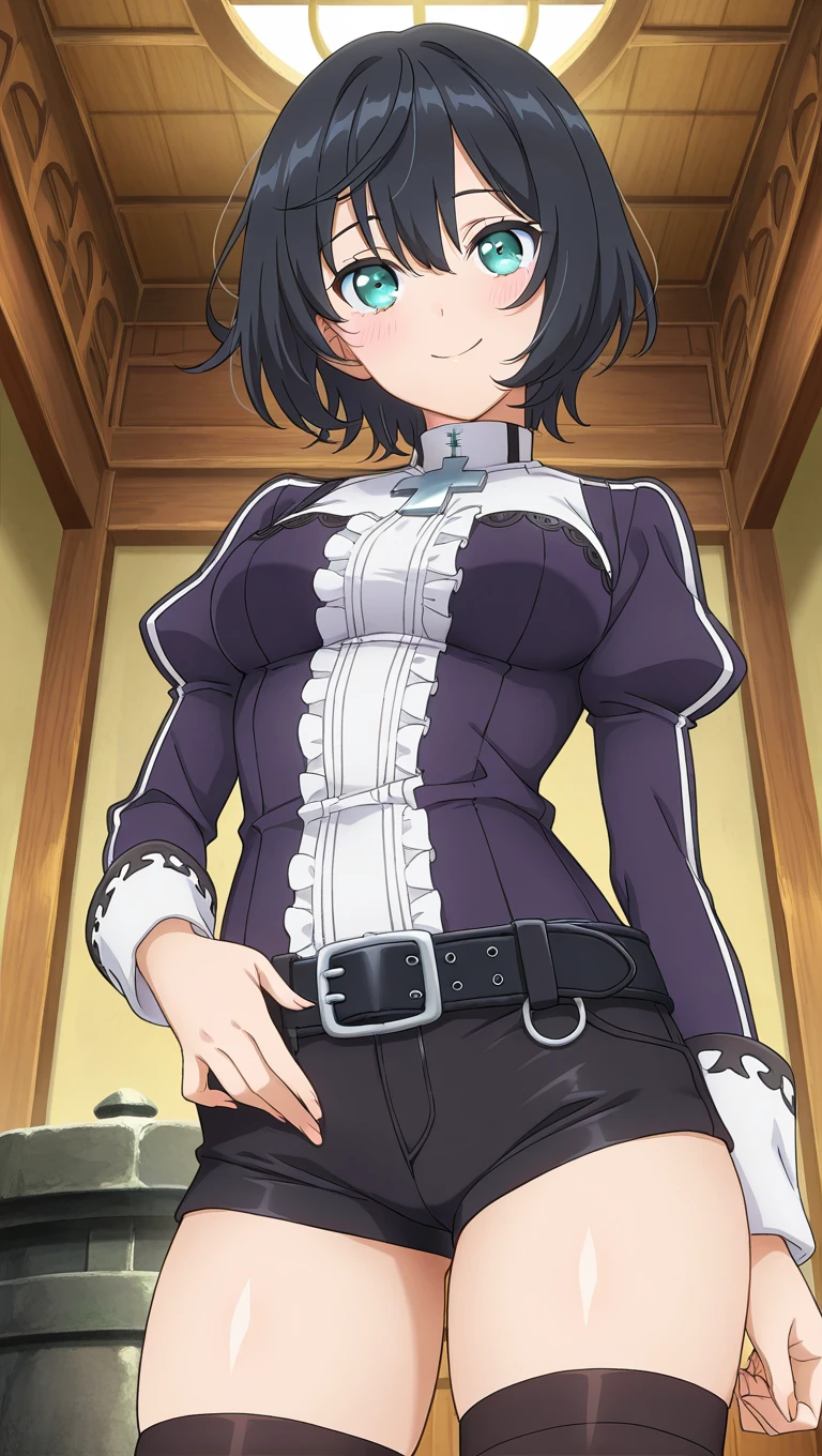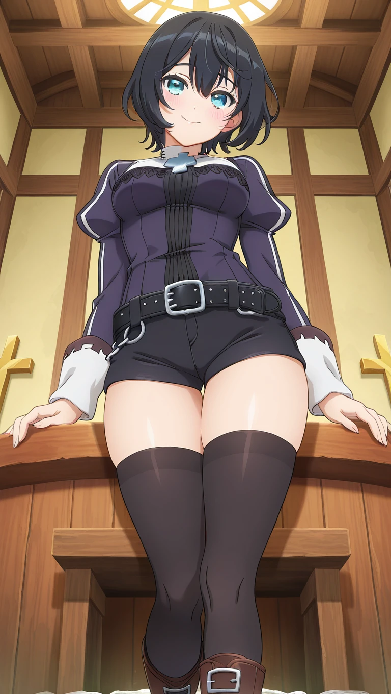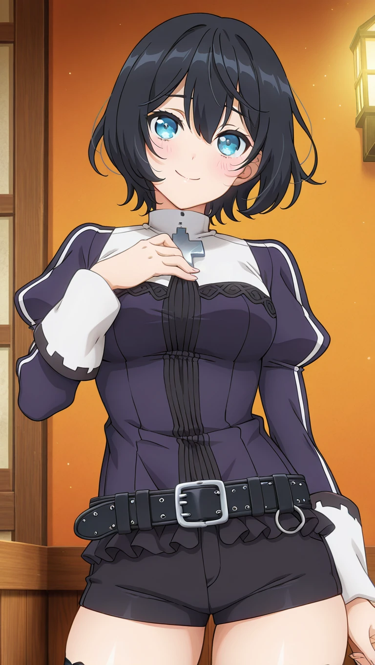 cross,purple jacket,long sleeves,puffy sleeves,medium breasts,black belt,frills,black shorts,buckle,short shorts,thighs,black thighhighs,boots,brown footwear