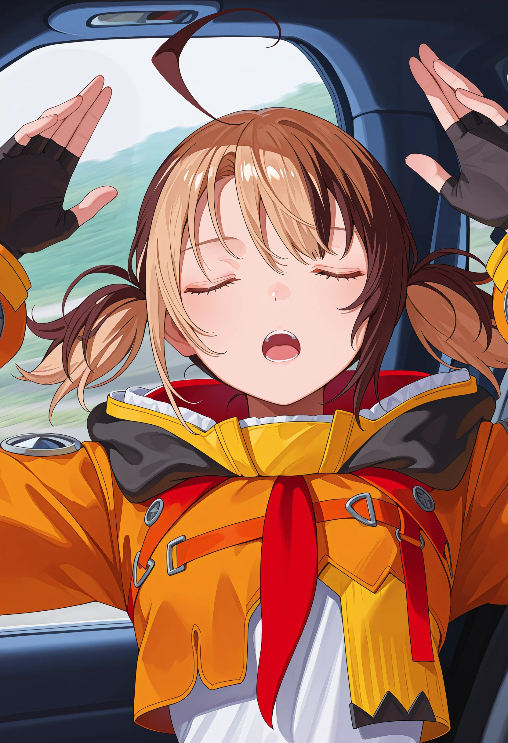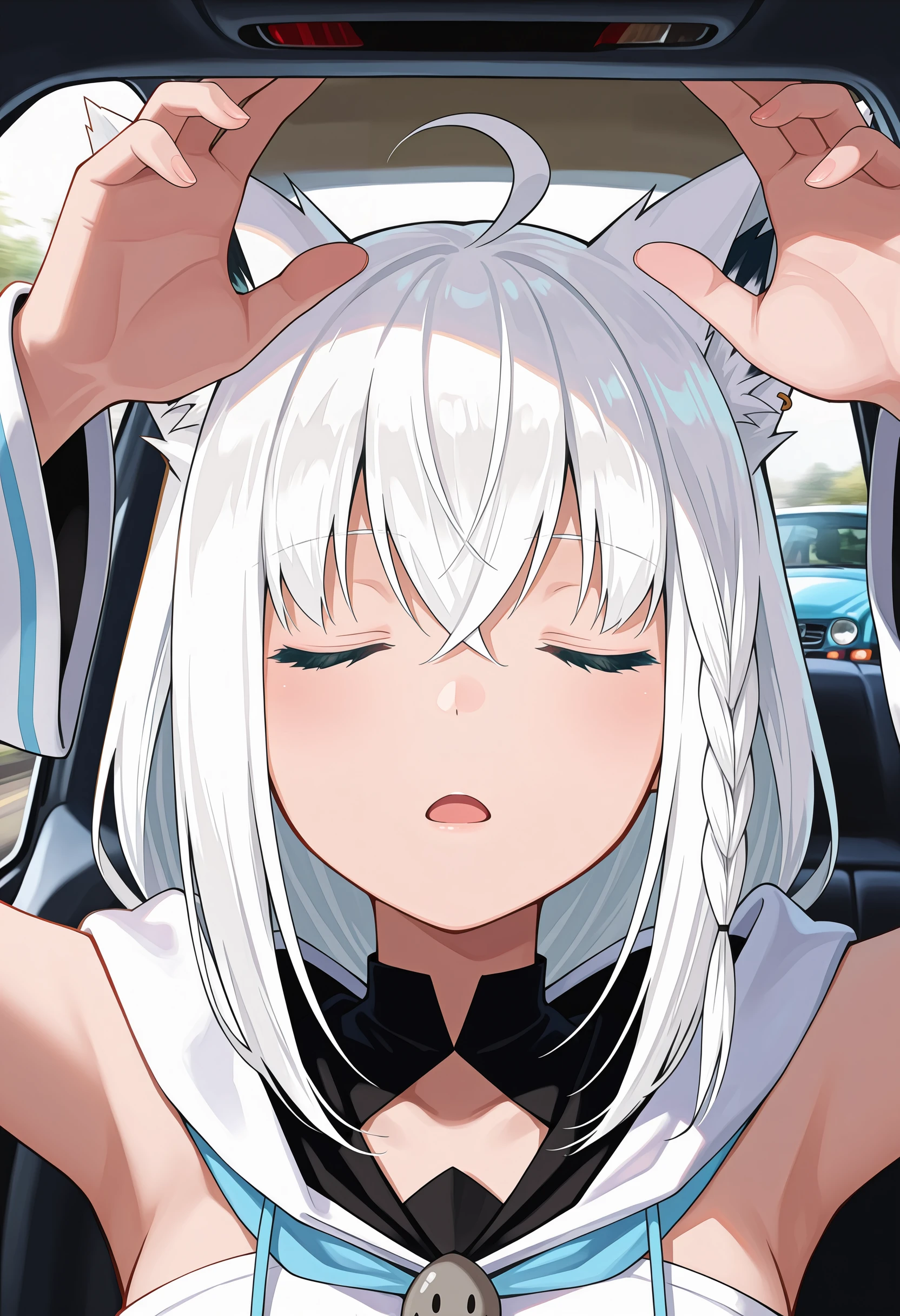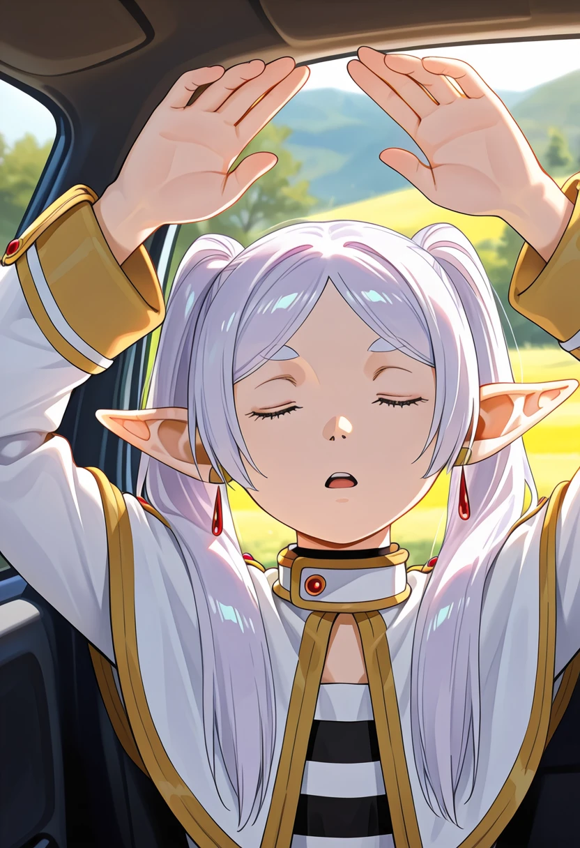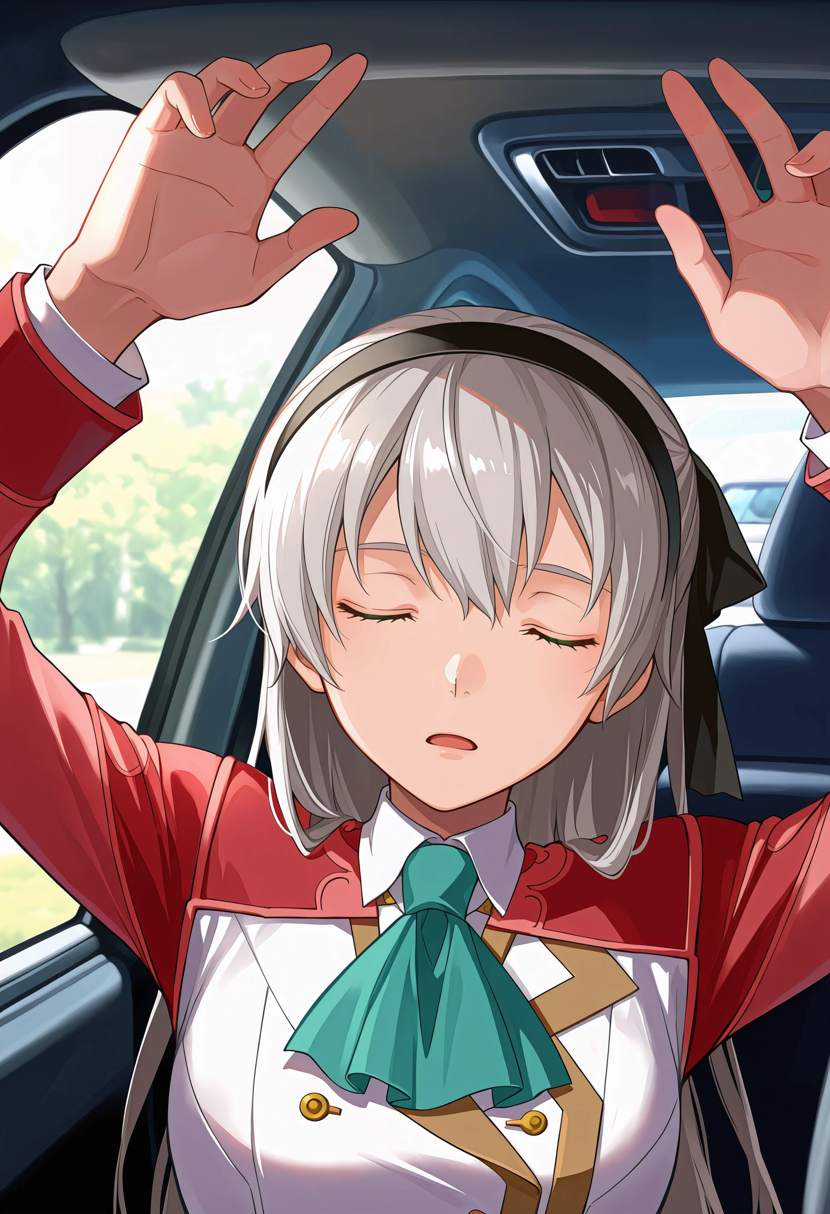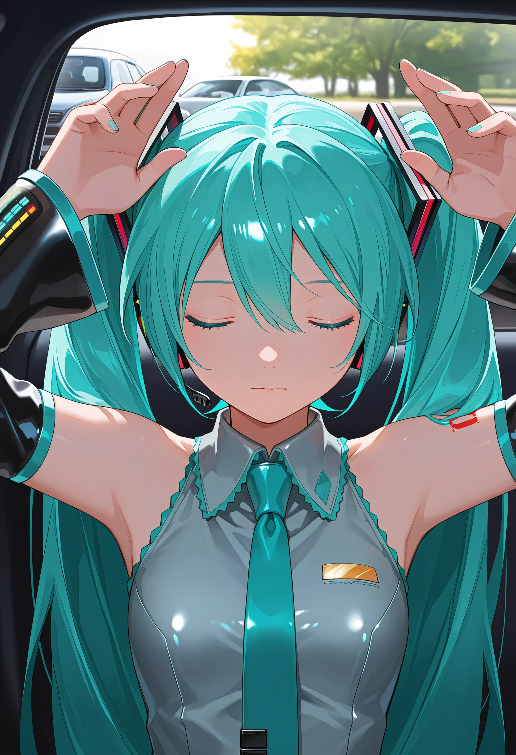 Pose: facing viewer, arms up, closed eyes, upper body,