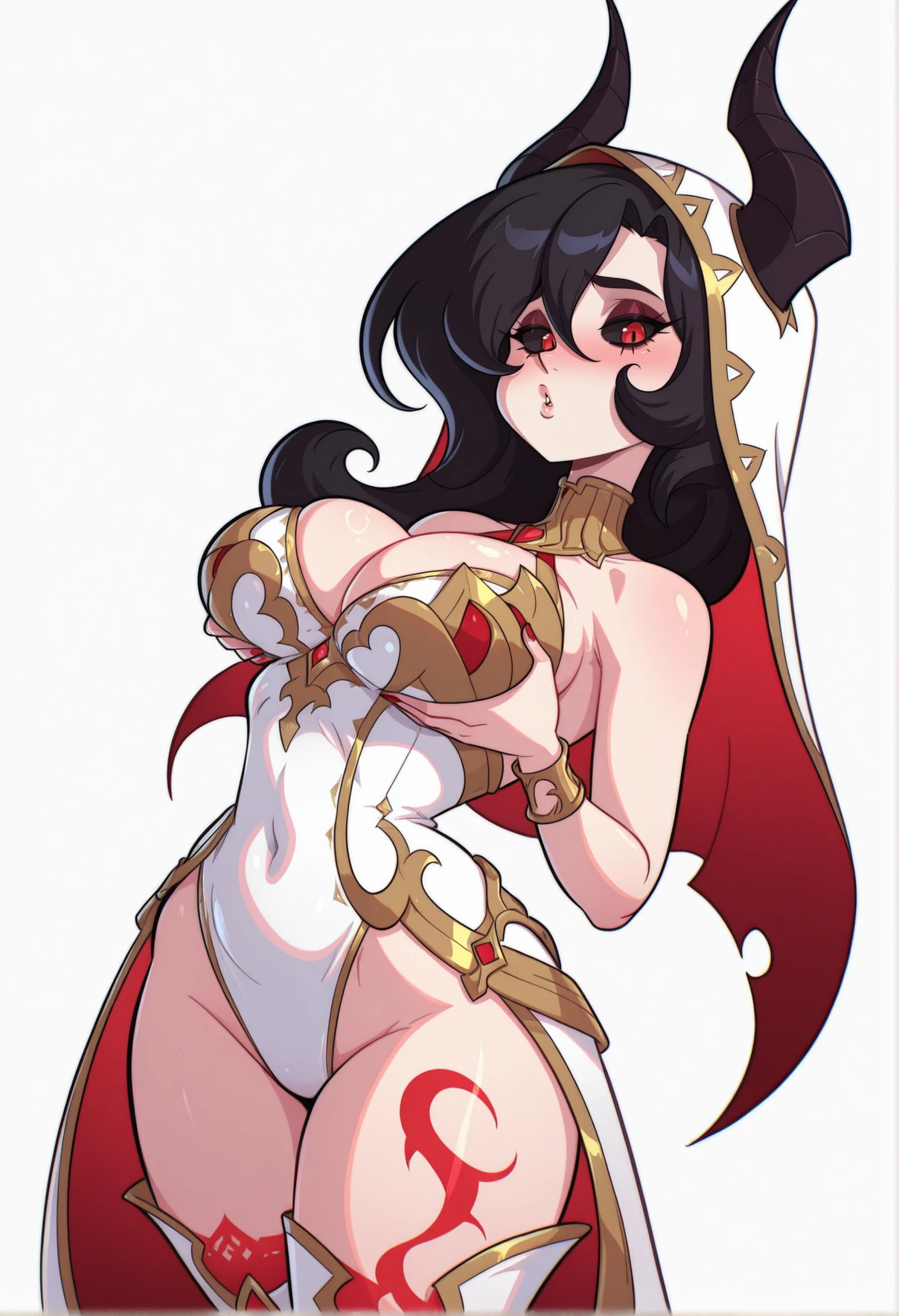 serenmira, long wavy black hair, red eyes, black sclera, black sharp curved horns, white sleeveless dress, gold trim, golden ornaments, white veil, dress with red inner lining, thigh-high white and red boots, red tattoos,