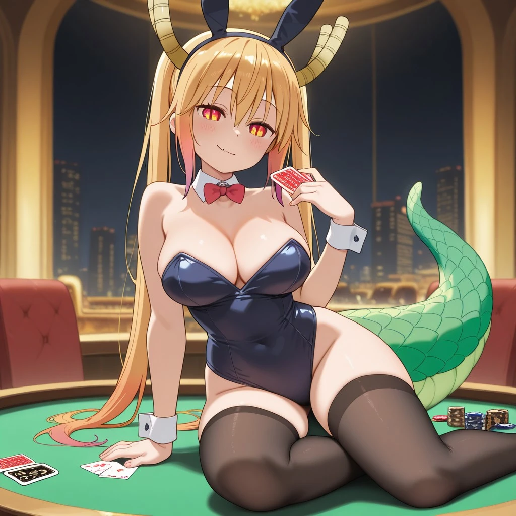 kanna_maidragon, horns, tail, low twintails, black bow, hair beads, white capelet, pink dress, white thighhighs, red shoes