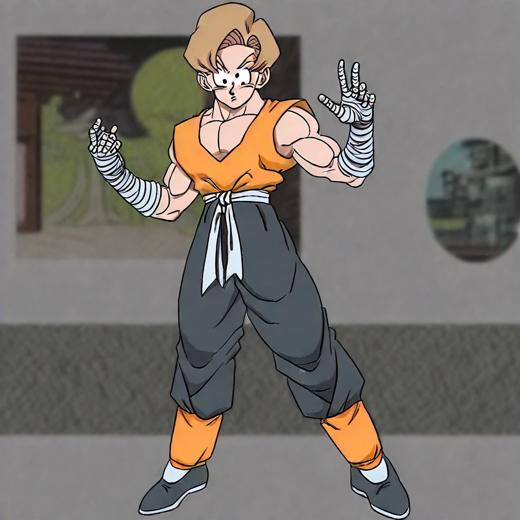 Prompt: Carthu YT, solo, 1boy, light brown hair, black eyes, muscular, orange dougi, bandages on forearms, bandages on hands, grey pants, white obi, orange legs wristband, grey shoes