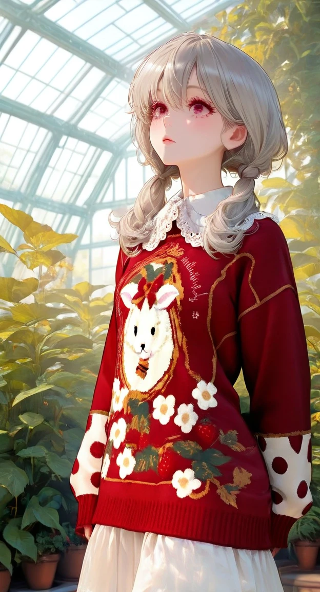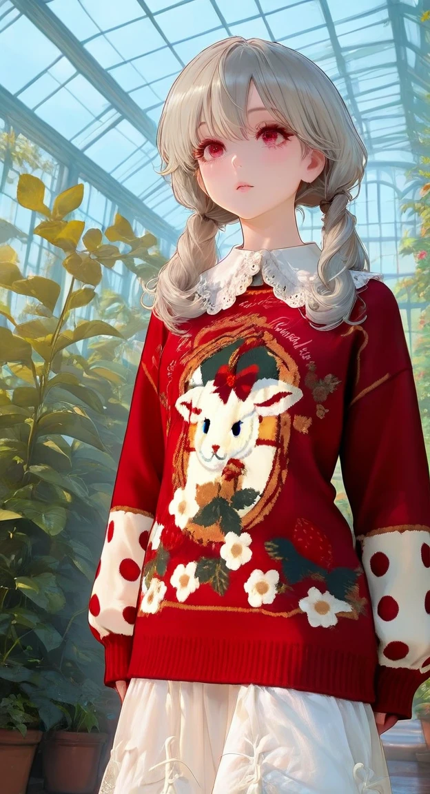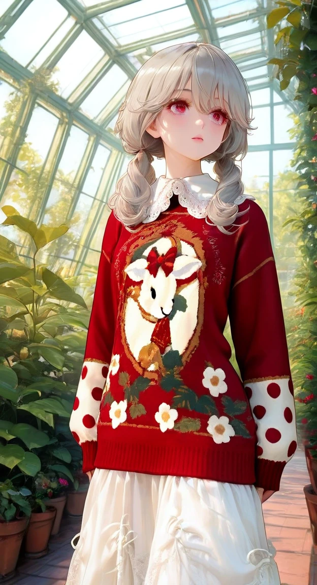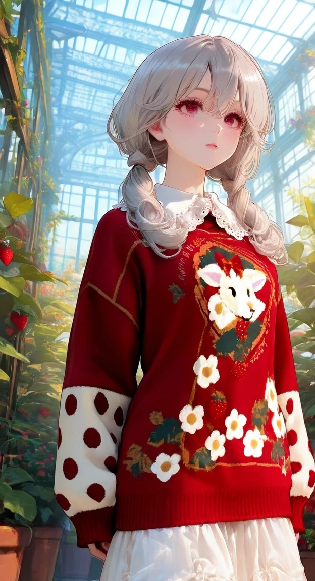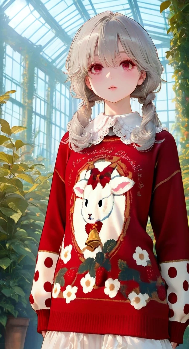 xg1, red sweater, goat-strawberry print sweater, polka-dot contrast sleeves, large lace collar