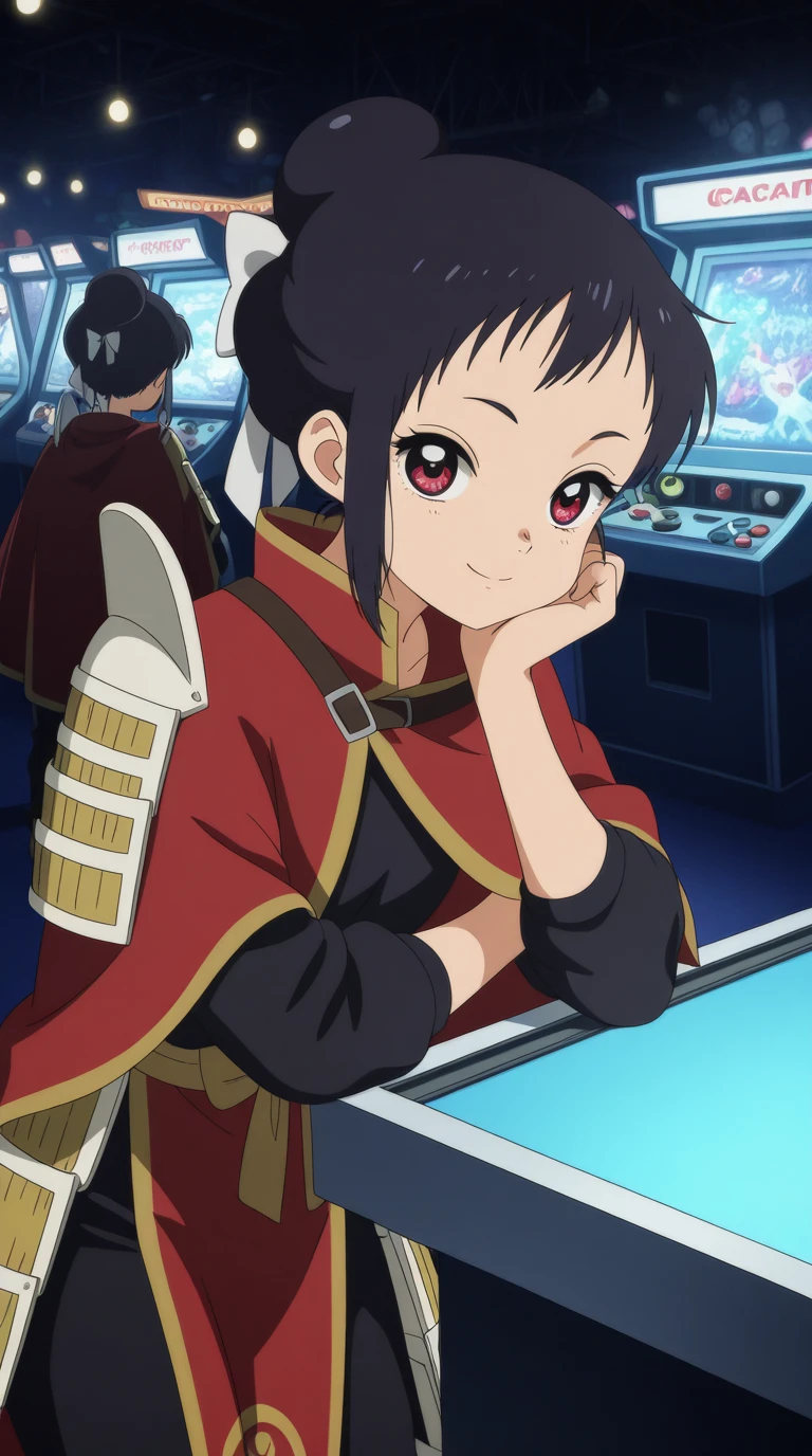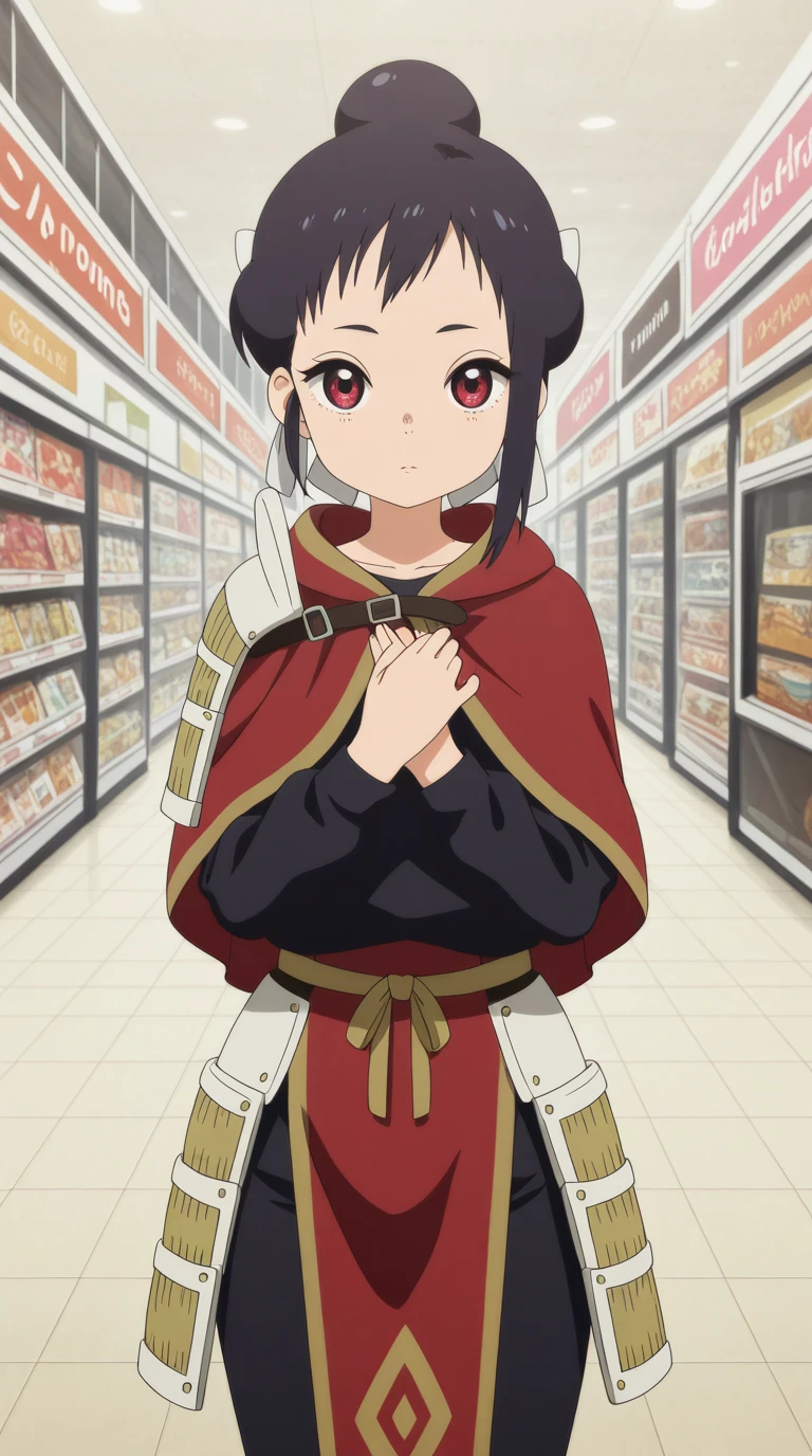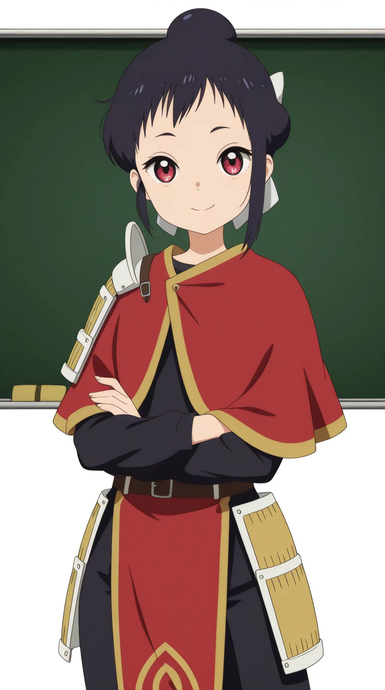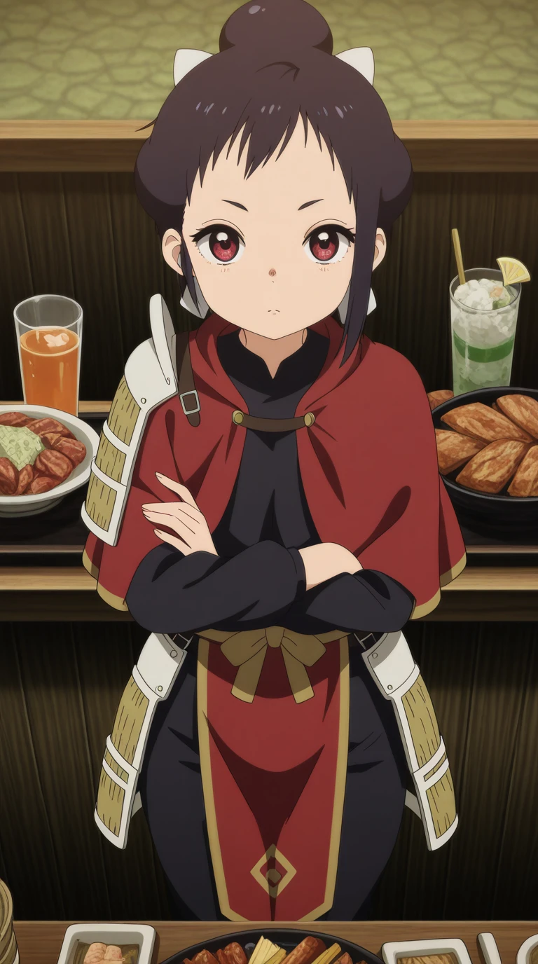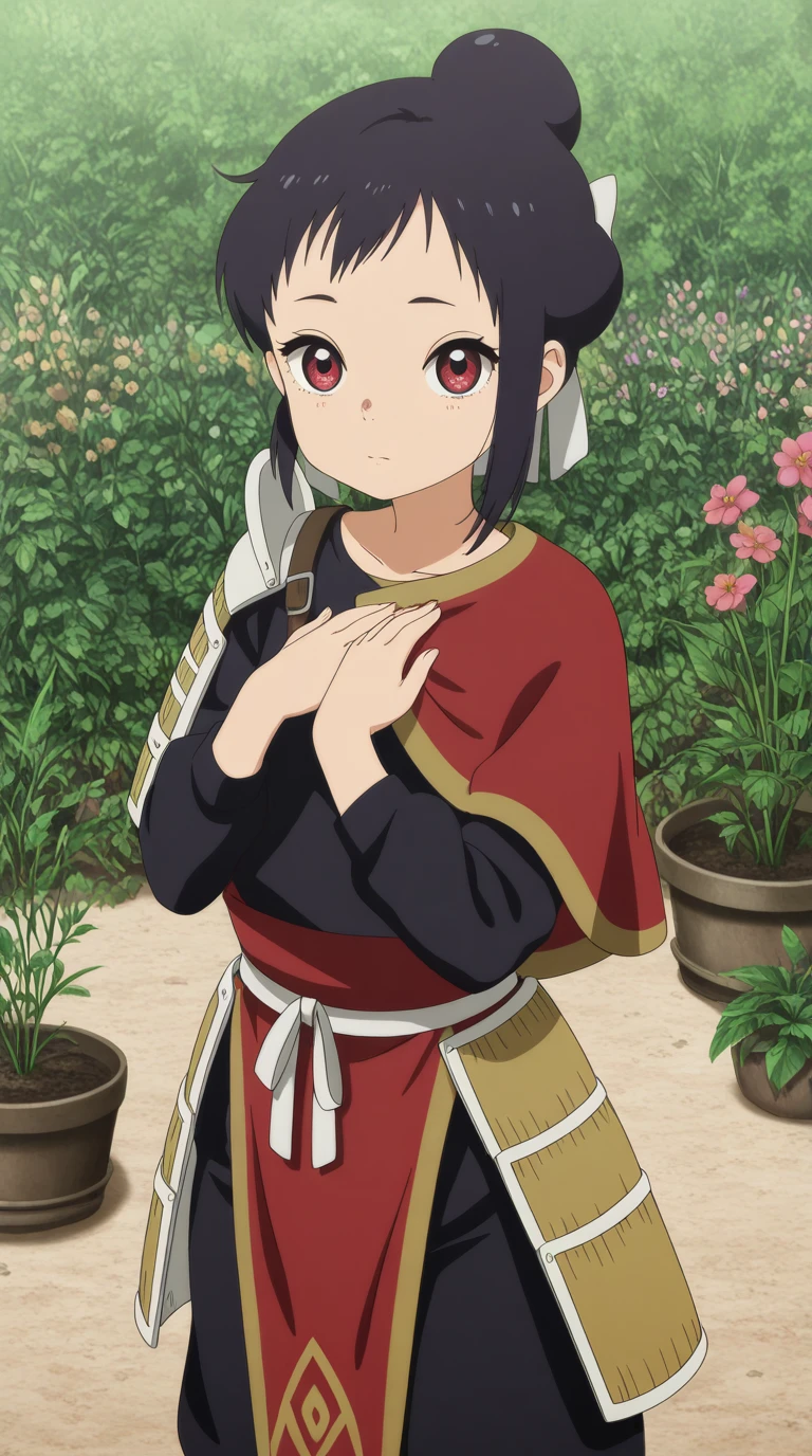 fumetsunoanatae hisame, short hair, black hair, red eyes, hair bun, single hair bun, anime screencap