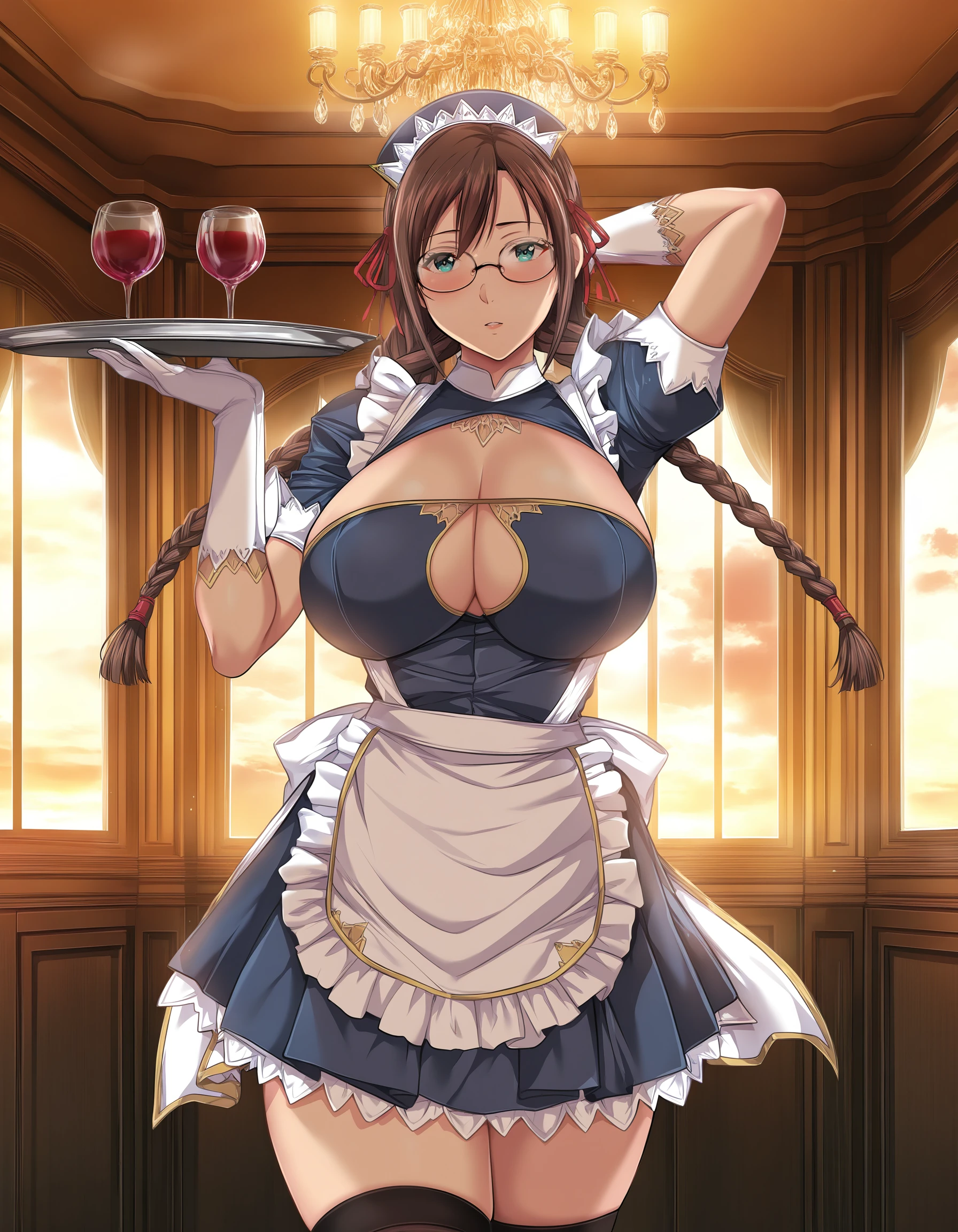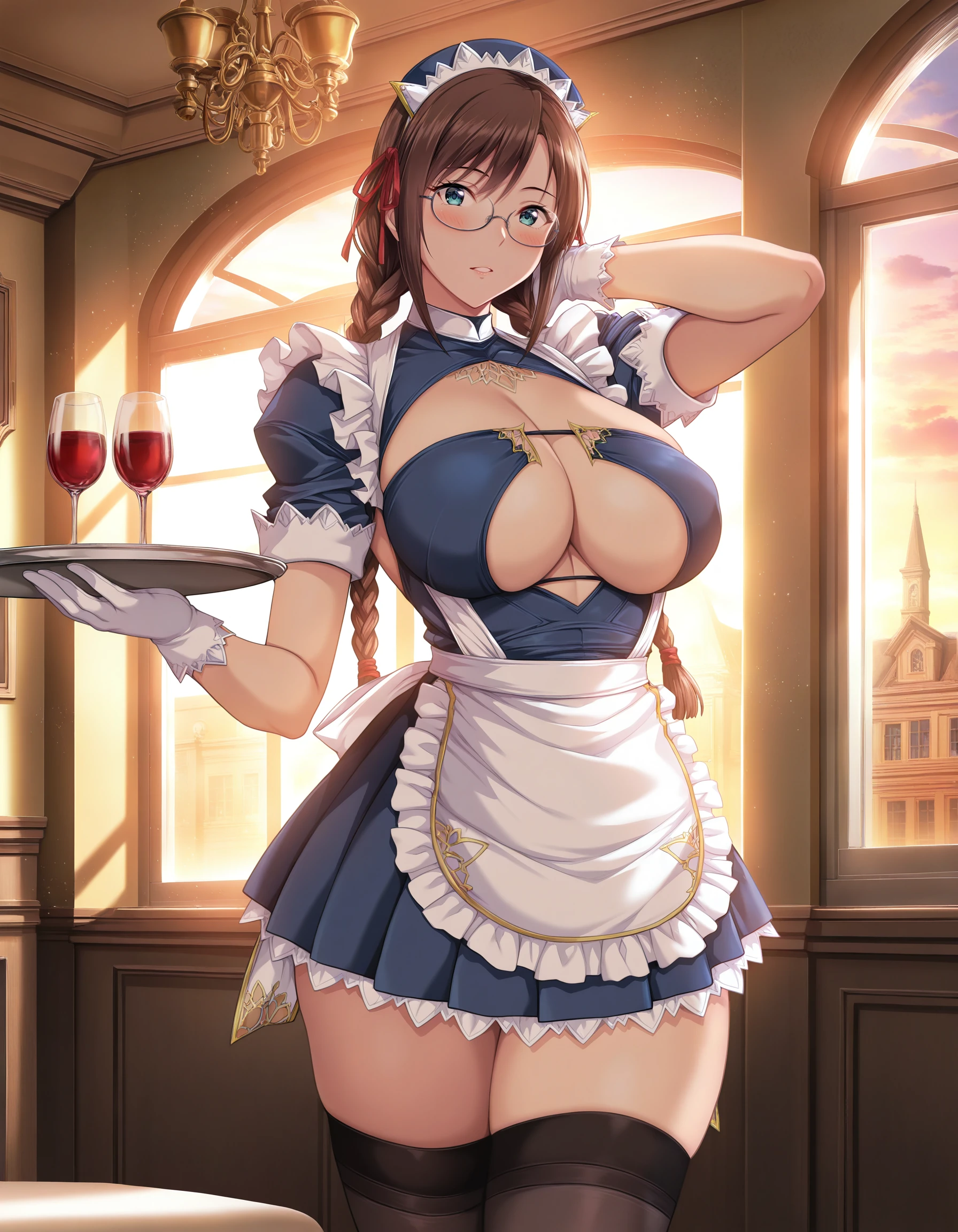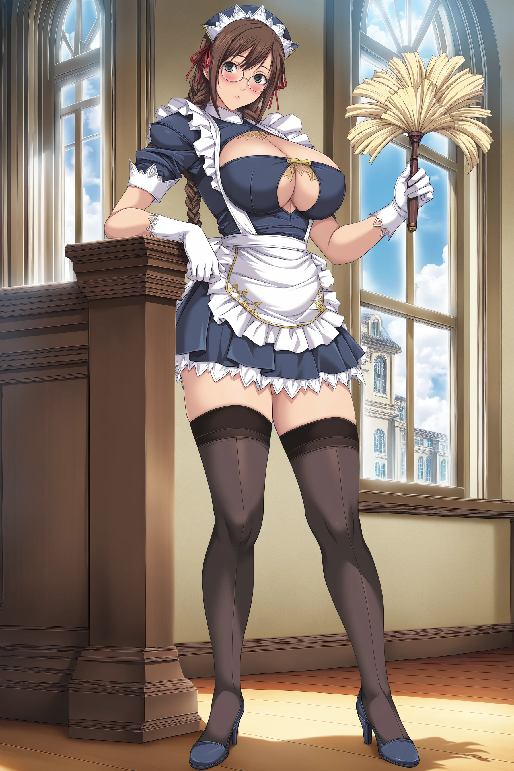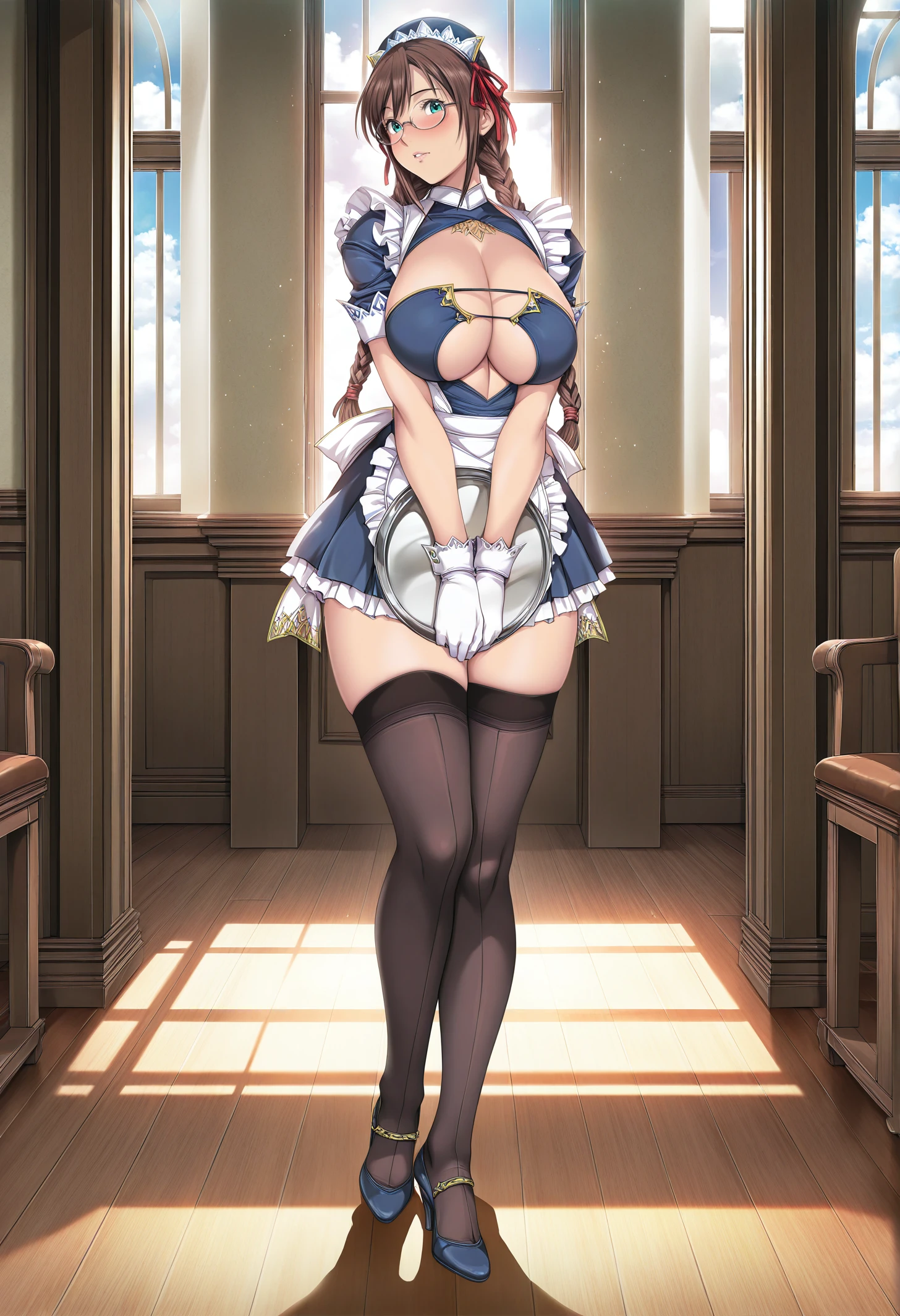 maid, blue dress, cleavage cutout, short sleeves, maid apron, pleated skirt, black thighhighs, white gloves, high heels