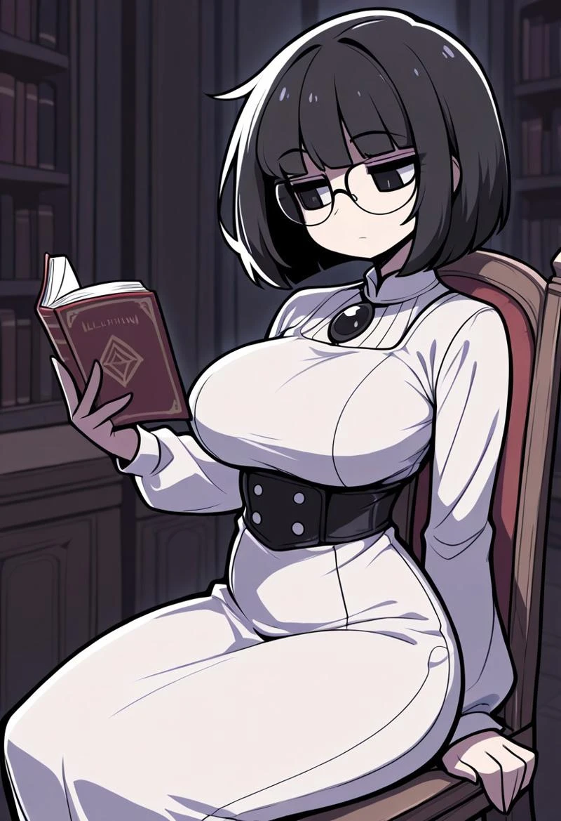 short hair, bob hairstyle, glasses, large breasts, black eyes, black hair, pale skin, slightly plump,