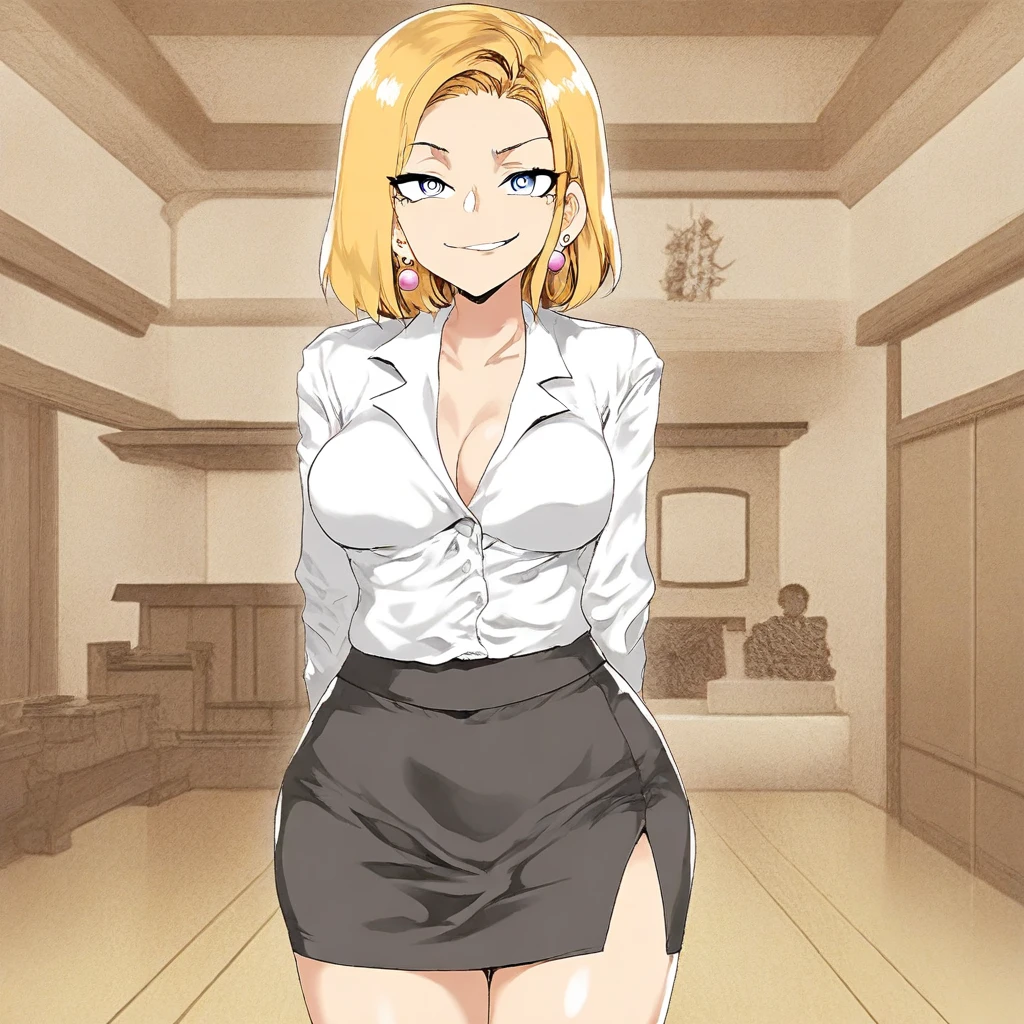 1. ((formal, long-sleeves white shirt, dark grey pencil skirt, pink pearl earring, ))