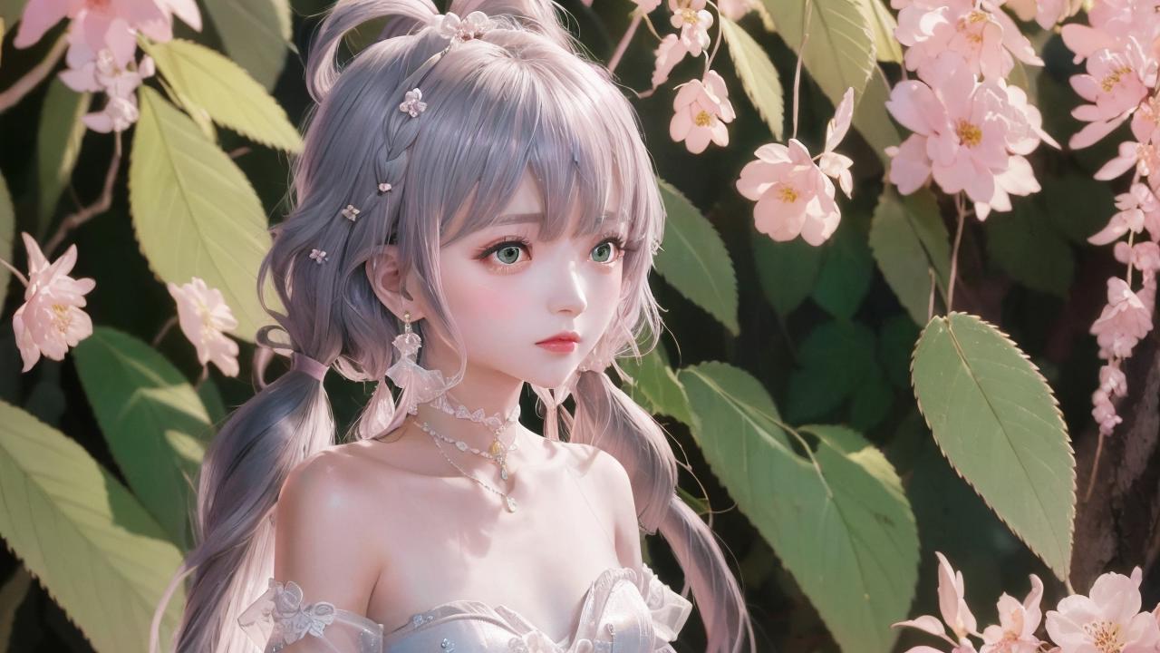 tags:masterpiece, best quality,solo,1girl,luotianyi,smile, jewelry, ribbon, earrings, rose, twintails, bangs, collarbone, dress, portrait, green eyes,grey hair, hair between eyes, upper body, looking at viewer, closed mouth,