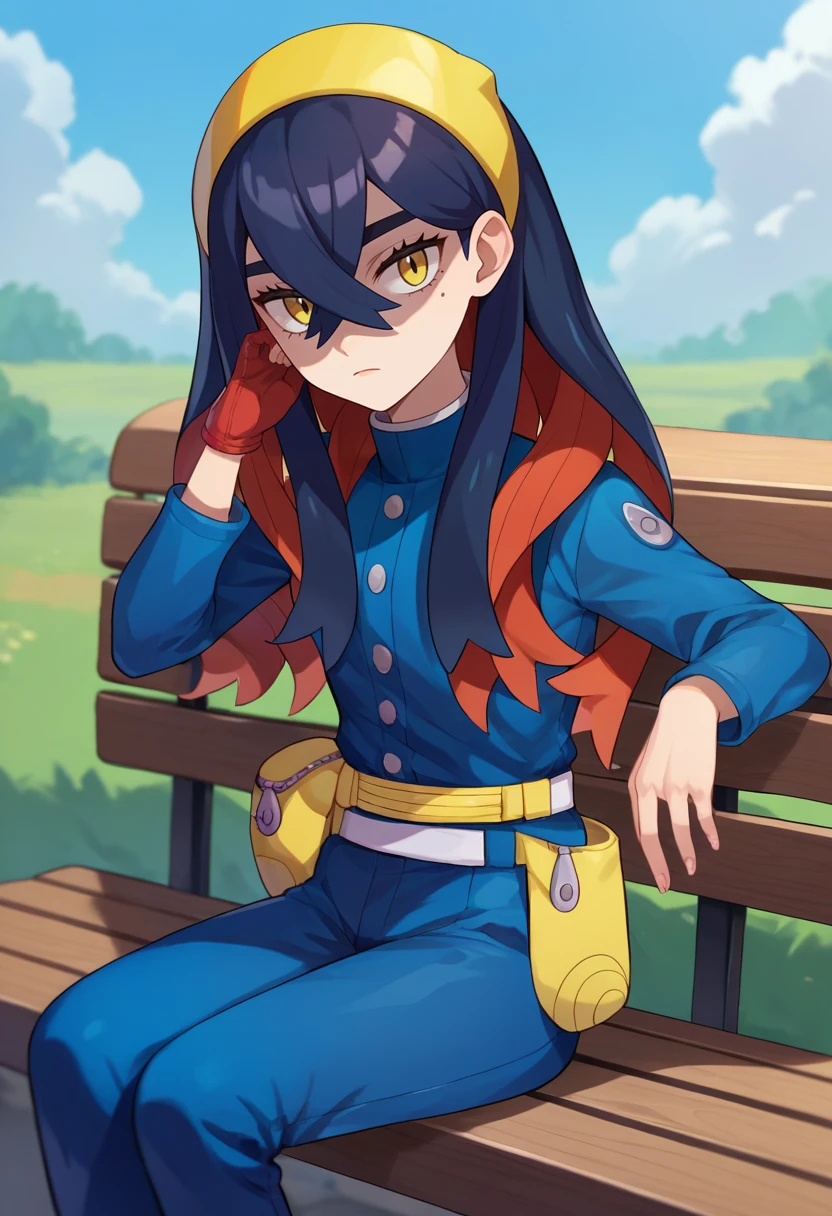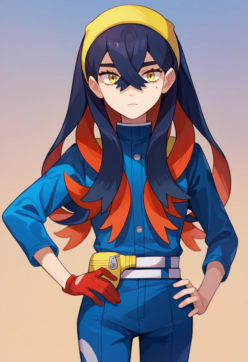 hairband, blue jacket, long sleeves, red gloves, single glove, blue pants, white belt, pouch