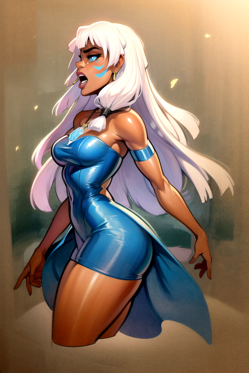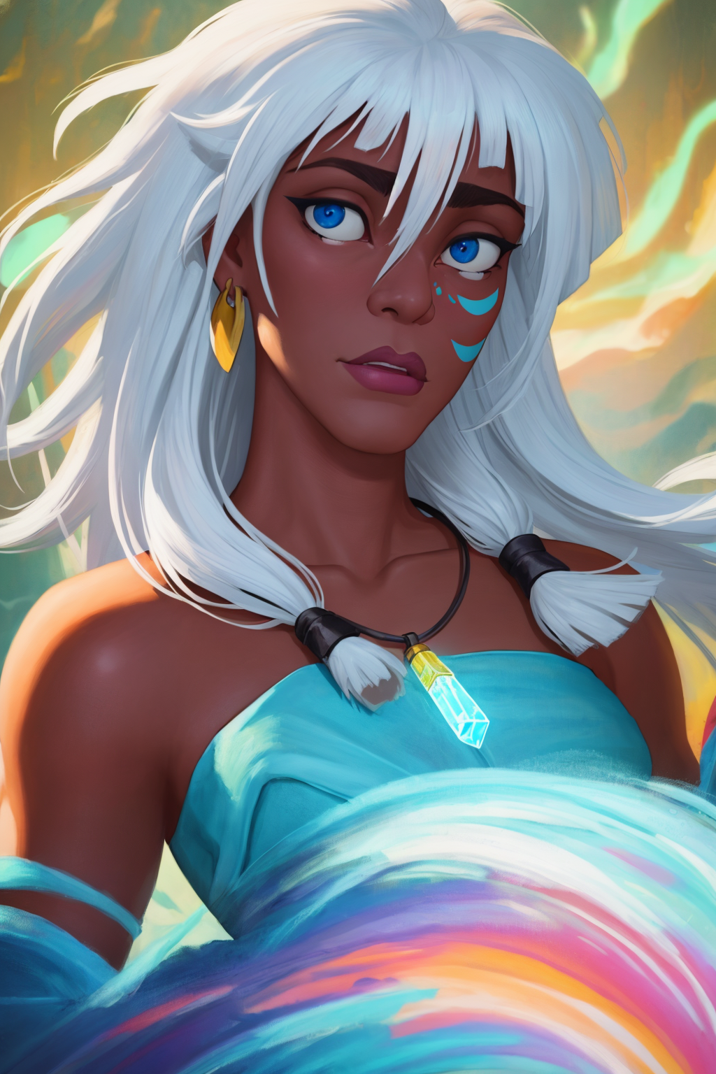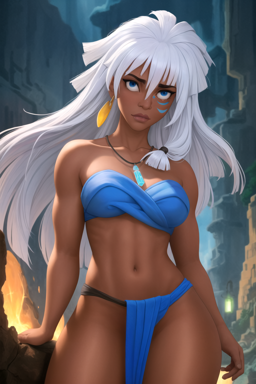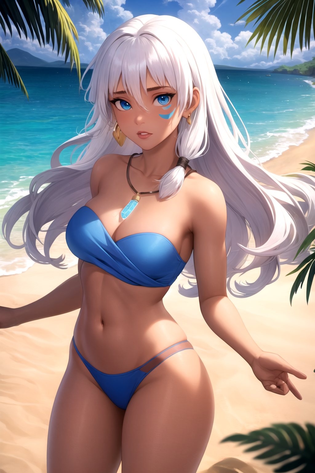 Other prompt : dark-skinned female, dark skin, long hair, white hair, blue eyes, necklace, facial mark, earrings