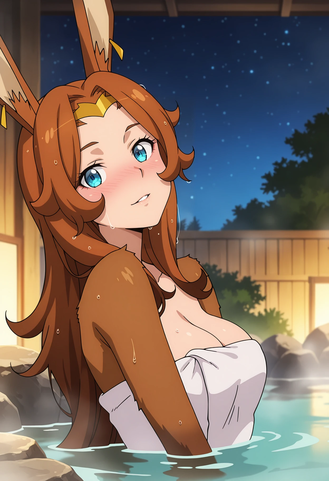 high ponytail, parted bangs, long hair, brown hair, blue eyes, rabbit ears, earrings, rabbit tail, monster girl, brown fur, facepaint, red lips, red headband, crop top, armlet, detached sleeves, fingerless gloves, black gloves, midriff, navel, loose belt, brown belt, pelvic curtain, red skirt