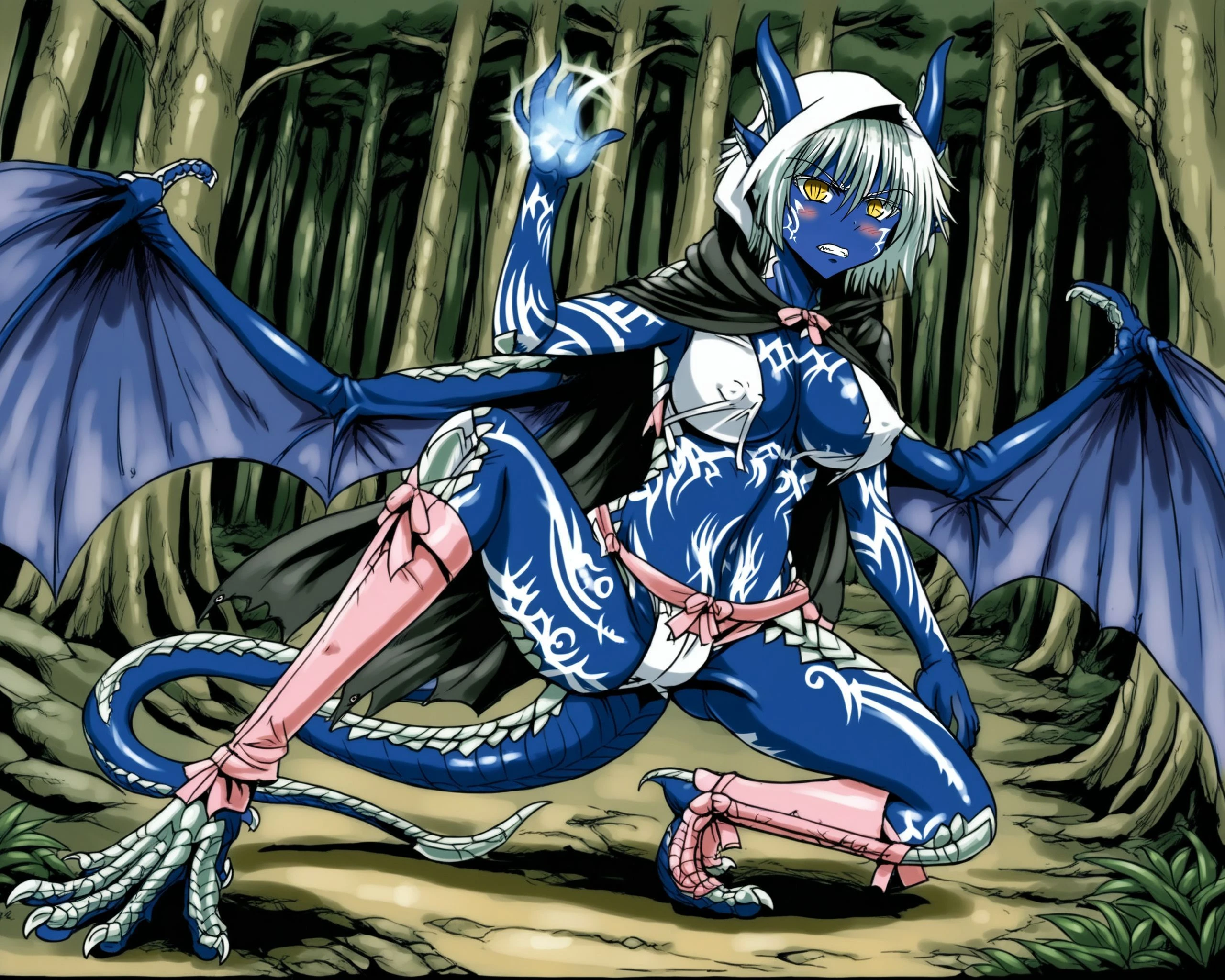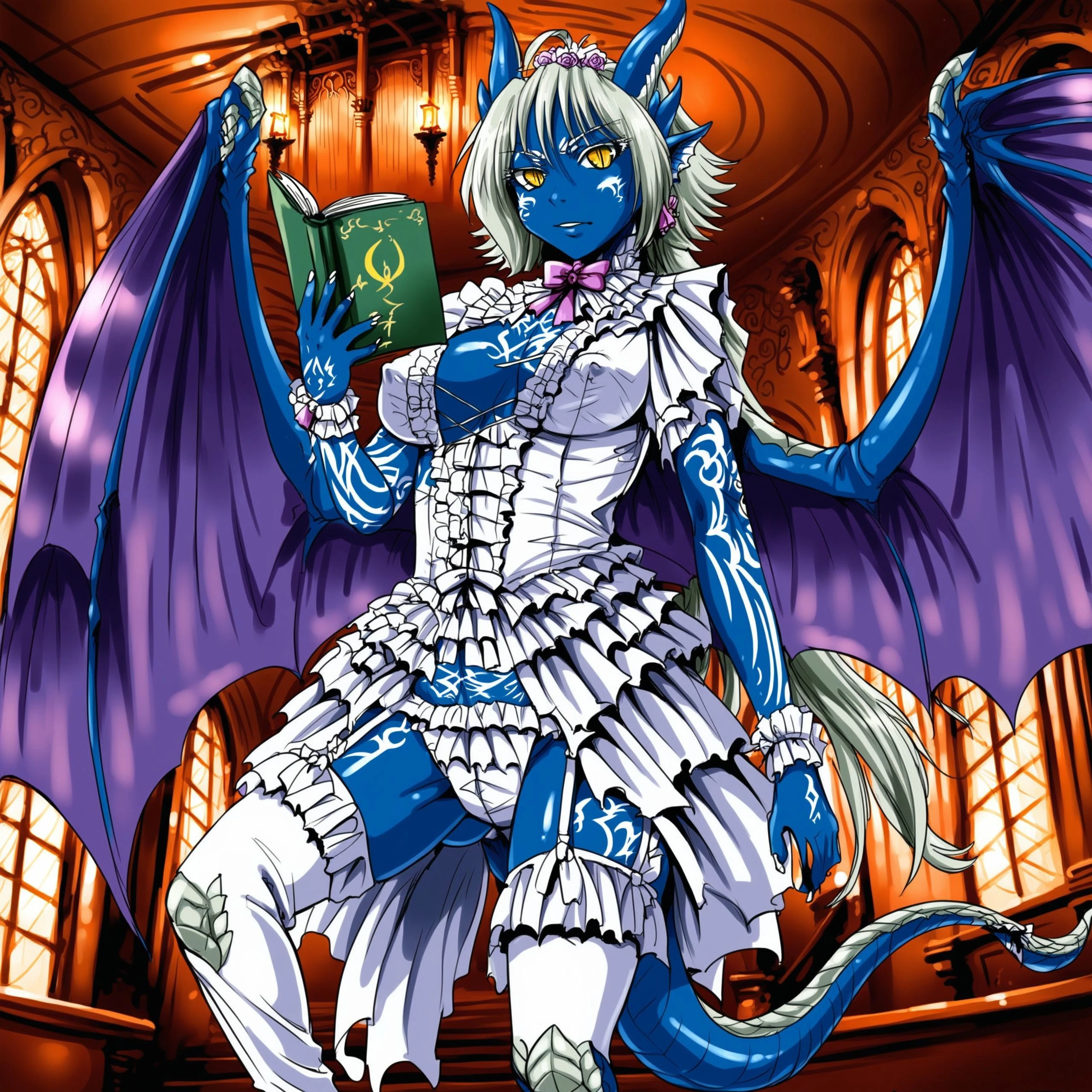 giselle, wedding dress,covered ???????, blue skin, horns, slit pupils,feets,scales,tail, wings, yellow eyes