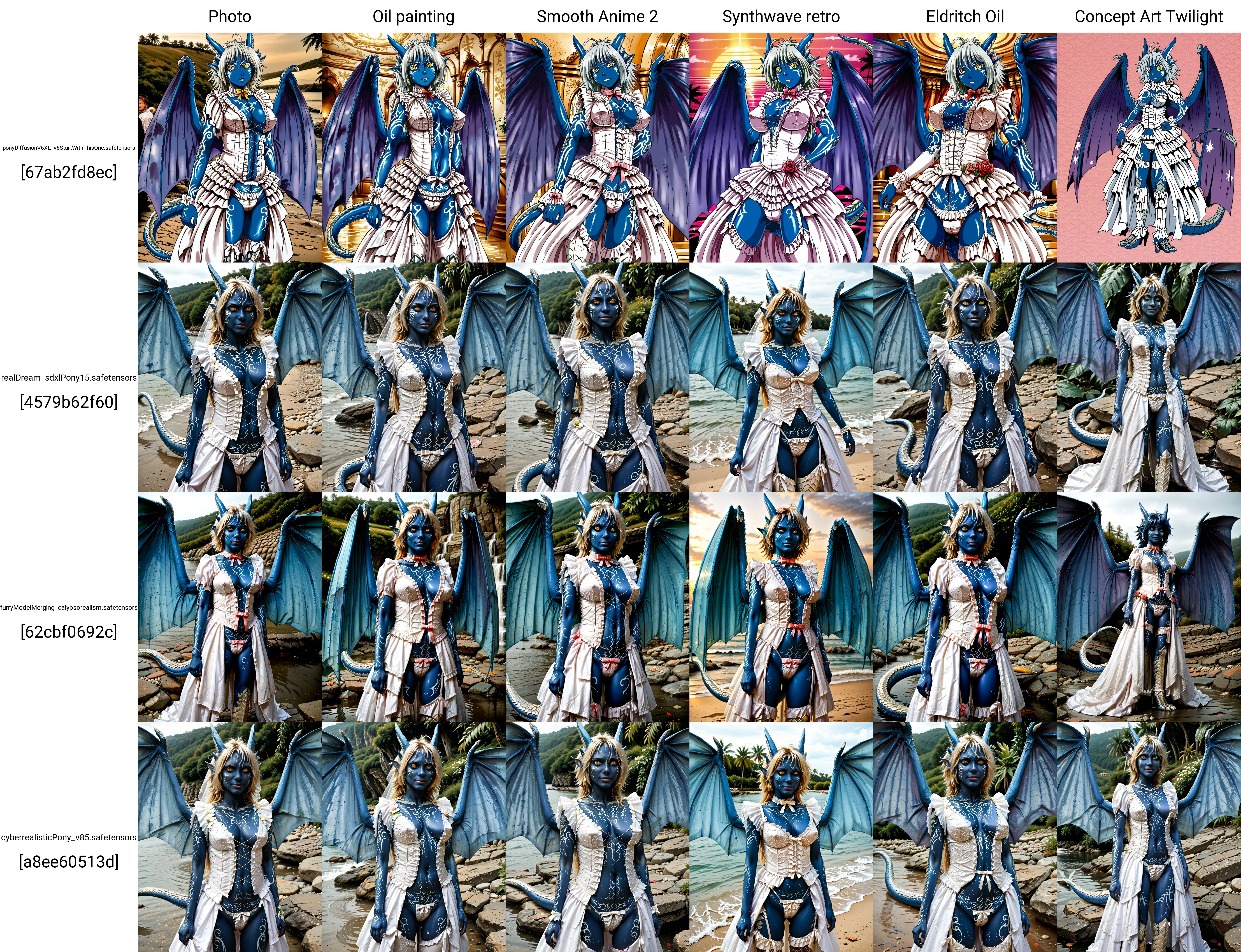 This version of Lora is for Flux Dev. To generate the character, simply mention her name, but it's better to also specify that she has wings, a tail, and any type of clothing. This will result in a full-body image. The word "dress" will create her default outfit.